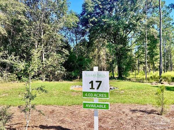Discover the beauty of NatureWalk at Pond Creek, one of the most prestigious land communities in Northwest Florida. NatureWalk is nestled amidst pine tree forests, lush greenery, scattered oaks, and natural flowing creeks. The idealistic landscape is almost "untouched," providing privacy, peace, and serenity for each lot. Lot 17 is a private 4.03-acre property located at the end of Pine Preserve Ln. What makes this parcel special is its cul-de-sac location and the beautiful natural buffer on the northwest side of the property. This lot features a diverse array of vegetation, including mature pines, oaks, magnolia trees, and other trees that surround the hardwood area. Lot 17 has approximately 0.75 acres of mulched area for the future homesite. ADDITIONAL COMMUNITY INFORMATION: NatureWalk at Pond Creek community was launched in 2023, and since then, this exclusive community has become a place that attracts buyers from all across the United States. The Owner's vision for this community is simple: Quality Family Living Centered Around Nature. Curved and paved roads, a distinctive community layout thoughtfully combined with Northwest Florida's natural beauty, high-end landscape features, common areas set in a scenic natural environment, and high-speed internet are all reasons for that. This unique community is situated on 653 acres of land, comprising 100 lots in total, and features homesites ranging from 2 to 15+ acres, including premium creek-front parcels. As of July 2025, close to 50 out of 100 parcels have been sold. LOCATION: Another aspect that makes this community very special is its location. NatureWalk at Pond Creek is conveniently located within a short drive of Publix, Big-Box stores, restaurants, and hospitals. Our community is centrally located for outdoor enthusiasts: from Blackwater River freshwater fishing and boating to our Gulf Coast, featuring the emerald blue waters of the Gulf of Mexico and beautiful beaches.