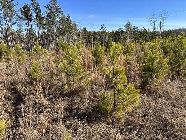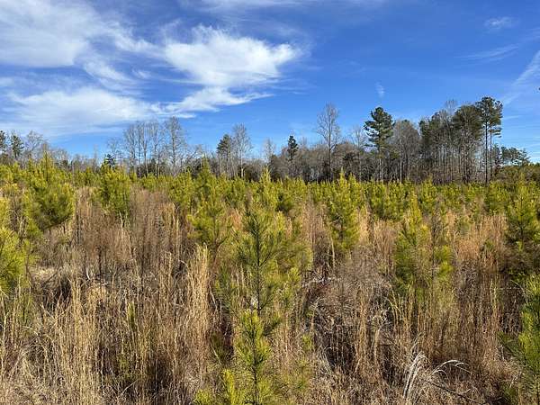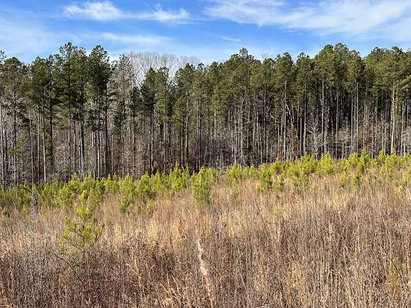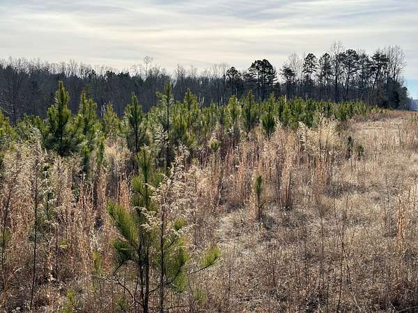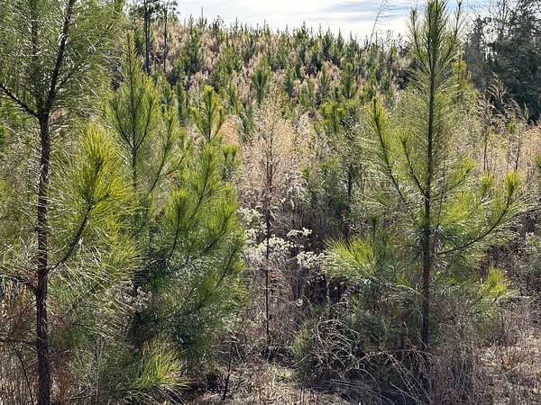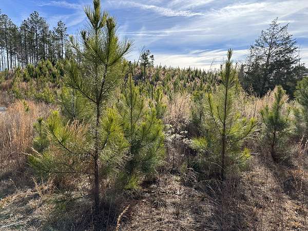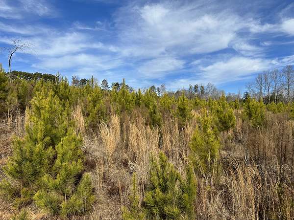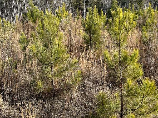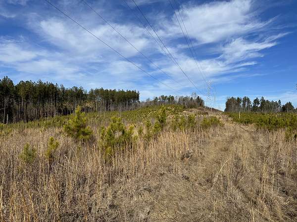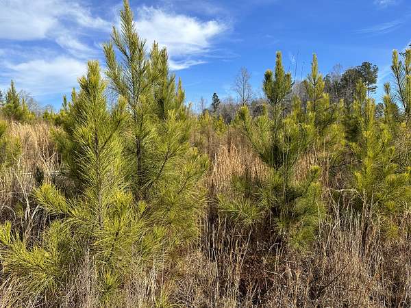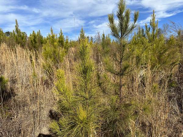 About 44 acres are forested with loblolly pine planted in 2021 and now in their fifth growing season. These young trees are healthy and growing fast. The upper end of Browns Branch is a small stream that crosses the back side of the land. Some steep slopes overlook the little stream. Older pines, interspersed with a few hardwoods, stand in patches that collectively cover approximately 12 acres. A steel tower power line crosses the property about two-thirds of the way back from the paved road, occupying a right-of-way that spans about 5 acres.