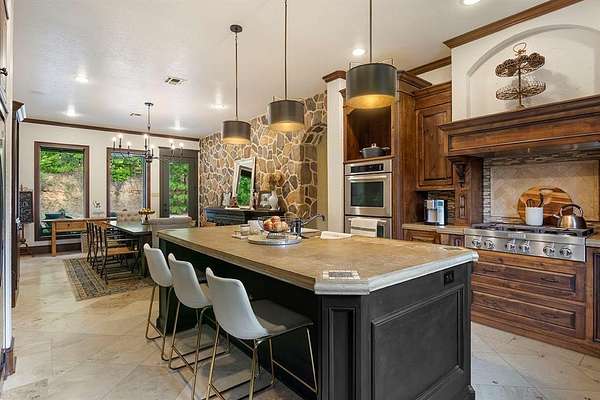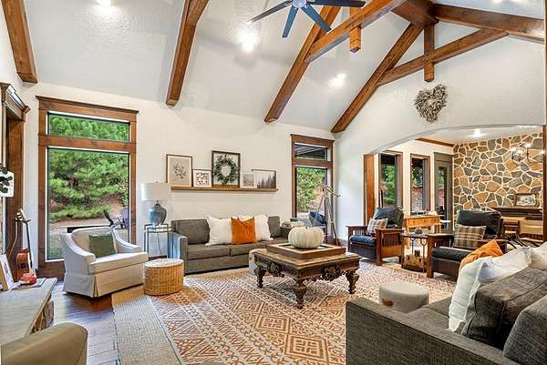 Discover country living at its finest in your very own Castle in the Woods on over 40 acres! Tucked away in a peaceful country setting this spectacular 5 bedroom 3.5 bath home blends wide-open views and privacy with all the conveniences of modern living. From the moment you arrive, the stately exterior and welcoming entry set the tone for the elegance found throughout. Inside, the home opens to soaring 16 ft ceilings, spacious living areas, exposed beams, stone fireplace and custom crafted wood. Walls of windows flood the home with natural light that create a warm and inviting atmosphere. The open-concept design is perfect for both everyday comfort and entertaining, with the living room flowing seamlessly into a chef's kitchen featuring custom cabinetry with concrete counters, an oversized island, double ovens, gas stovetop and plenty of storage. The dining area allows for memorable gatherings and a casual place to enjoy morning coffee or dinner with family and friends. The primary suite is a private retreat, complete with a spa-like bath boasting separate vanities, a soaking tub, and a separate custom tile walk-in shower. Some of the many standout features of this home are the additional family room, home office, exercise room, game room and a media room, offering the perfect setting for movie nights. Outdoors you'll find a spacious covered patio where you can enjoy country sunsets and just relax surrounded by the sights and sounds of nature. If you've been searching for a luxury retreat in the country that is as functional as it is beautiful this is the one to see!