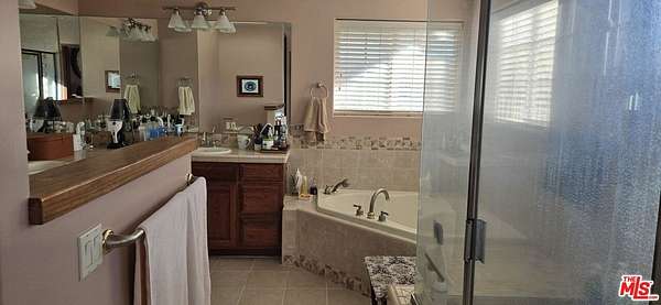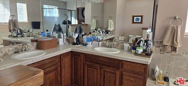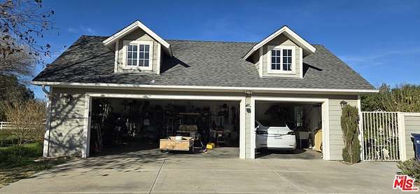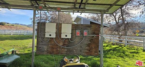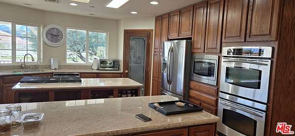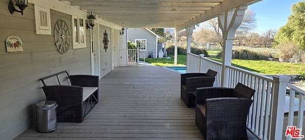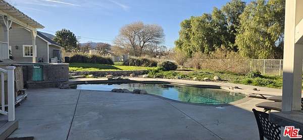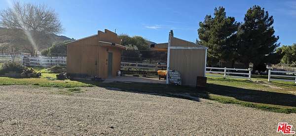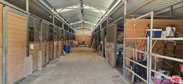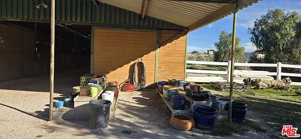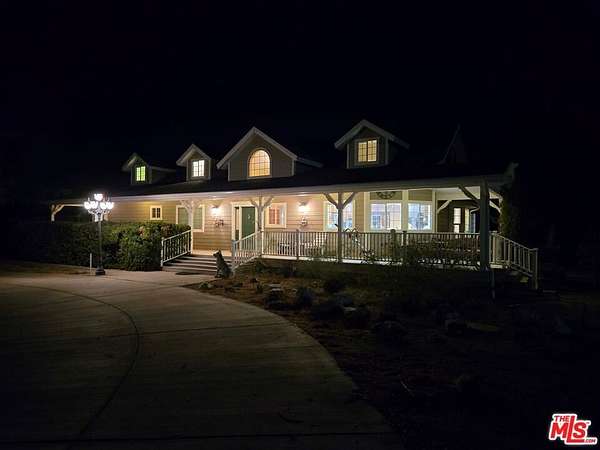 Exceptional equestrian horse ranch offering privacy, functionality, and resort-style living. Custom-built in 2004 with fire-resistant fiber-cement siding, 2x6 construction, and composite porches. Light-filled open floor plan connects kitchen, dining, den, and living areas-ideal for entertaining. Living and dining room feature built-ins, fireplace with heat-circulating fan, built-in speakers, and French doors opening to expansive outdoor living. Chef's kitchen includes granite countertops, solid oak cabinetry, GE Profile stainless appliances, double ovens, dual sinks, wine storage, and generous prep space. Spacious primary suite with cathedral ceilings, surround sound, spa-style bath, and direct access to rear porch and spa. Finished basement offers second kitchen, wine cellar, office, entertaining areas, two bedrooms, and steam room. Oversized 3-car garage with EV charger. Designed for serious equestrian use, the property features a 13-stall Castlebrook barn, fully enclosed and lighted arena, round pen, hot walker (horse exerciser), wash rack, multiple turnouts, RV hookups, workshop, and support buildings. Resort-style backyard includes saltwater pool and spa with waterfall, Viking outdoor kitchen, covered patios, and automated gated entry. Energy-efficient amenities include solar, private well, water storage, RO filtration, tankless water heater, and heat pump. Approx. 200 pistachio trees, 150 fruit trees, and sweeping mountain and desert views complete this rare horse property.