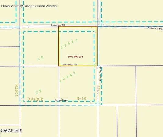 Est $186/moAPN: 3077-009-056 Coordinates: 34.624000, -117.938972 2.56 acres for sale in LA County. This lot is located one Ave N-8 and 105th St E in Palmdale, CA. Zoning is PDA2, per county records.