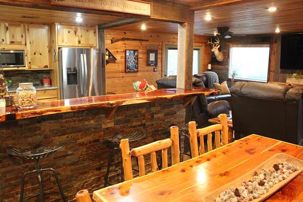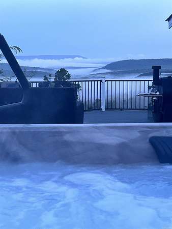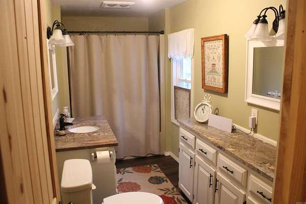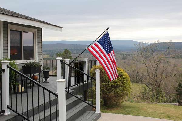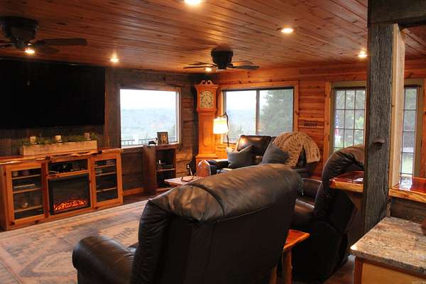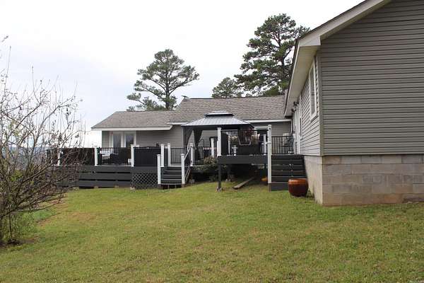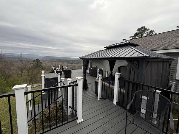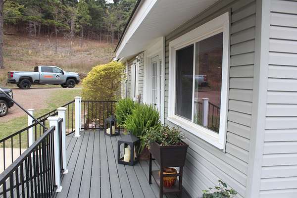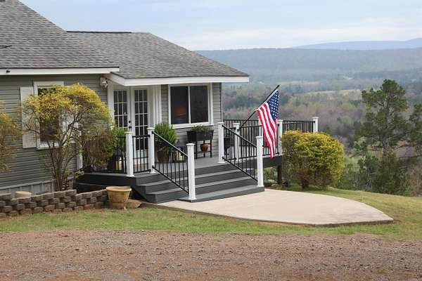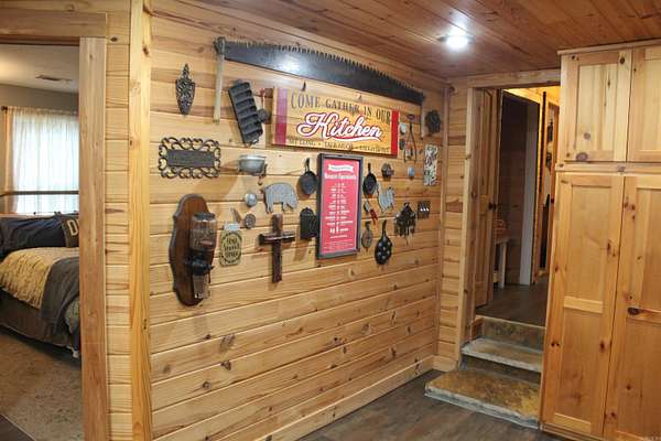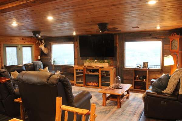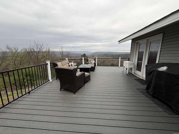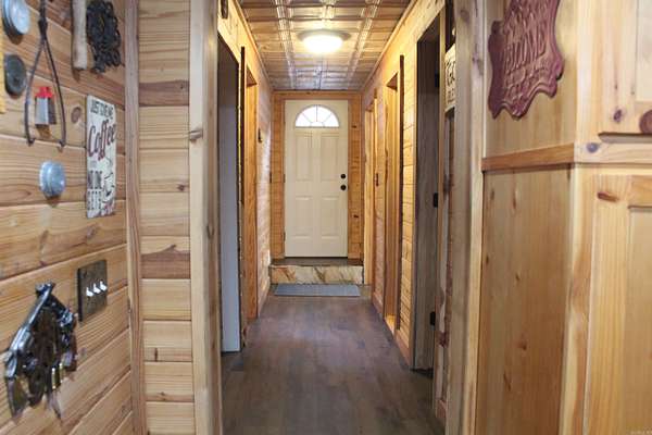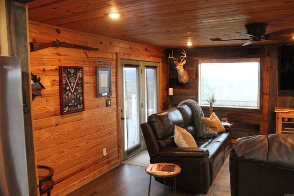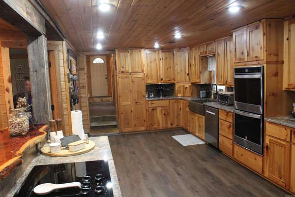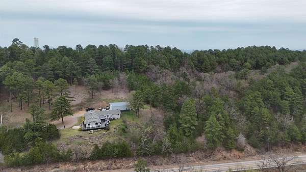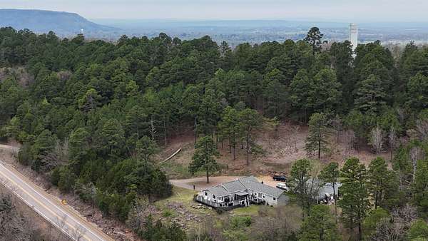 Situated just south of Paris, this exceptional residence is set on approximately 8.5 acres. The three-bedroom, two-bathroom home presents an impressive aesthetic. It features Luxury Vinyl Plank (LVP) flooring, Knotty Pine tongue-and-groove paneling adorning the walls and ceilings, custom countertops, and a cedar kitchen bar. The kitchen is further enhanced by custom-built knotty pine cabinetry, a hammered brass farmhouse sink, and built-in appliances that are less than one year old.Accents of rustic barn wood and corrugated tin distinguish this property. The residence features a low-maintenance exterior of vinyl siding and a shingle roof. The composite deck extends across the southern and eastern elevations, ensuring years of minimal upkeep. Whether one is enjoying morning coffee while observing the sunrise over Mount Magazine or viewing the sunset from the comfort of the hot tub, the vista is truly unparalleled. Adjacent to the main structure is a 30x40 shop featuring 14' sidewalls and a 10' sideshed. The shop is insulated and equipped with a mini-split system, providing year-round climate control for various projects. Furthermore, the shop is plumbed for a future bathroom