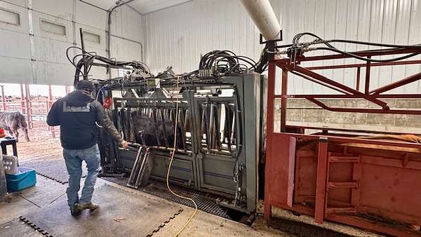 Indoor processing facility with Daniels tub and alley. Silencer hydraulic working chute. Design and construction by Settje Agri-Services and Engineering. Sorting alley with hydraulic gates.