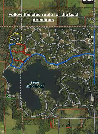 From Evart, MI (US10 & Main Street). South on Main St to 85th Ave, 85th Ave will turn into S 80th Ave, Continue on South 80th Ave until 1 Mile Road. West on 1 Mile Rd for 1 mile until stop sign at 90th Ave. South on 90th Ave to Lake Miramichi Main Entrance. West on Lake Miramichi Drive, many curves, to Manito Trl. North on Manito Trl to Pawnee Trl. Properties are on corner of Pawnee & Cayuga Trl