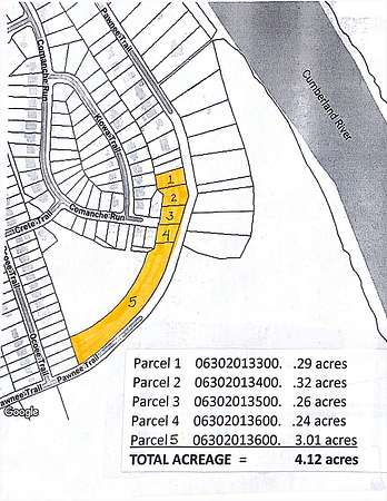 Est $1,857/mo4.12 acre Development Opportunity that parallels Cumberland River-Parcels accessible from existing right-of-way from North or South end of Pawnee Trail. Parcels also accessible from Comanche Run right-of-way all within Woods of Neeleys Bend Subdivision.