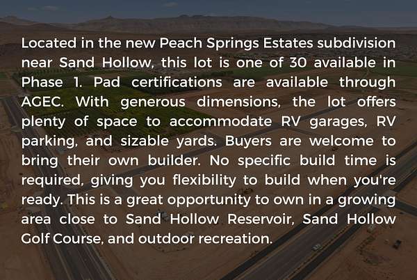 Est $1,530/moLocated in the new Peach Springs Estates subdivision near Sand Hollow, this lot is one of 30 available in Phase 1. Pad certifications are available through AGEC. With generous dimensions, the lot offers plenty of space to accommodate RV garages, RV parking, and sizable yards. Buyers are welcome to bring their own builder. No specific build time is required, giving you flexibility to build when you're ready. This is a great opportunity to own in a growing area close to Sand Hollow Reservoir, Sand Hollow Golf Course, and outdoor recreation.
