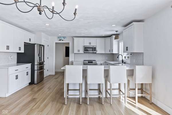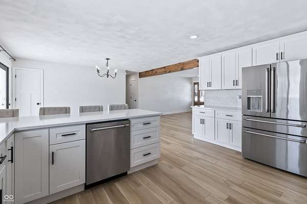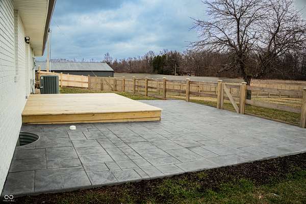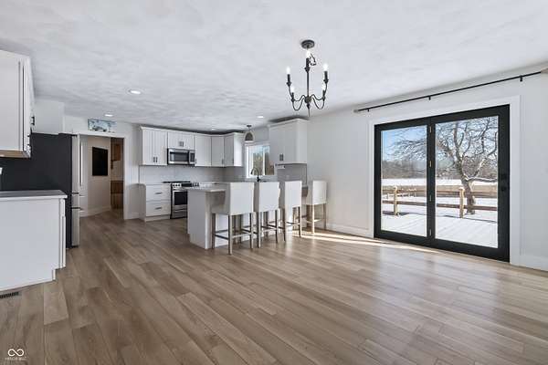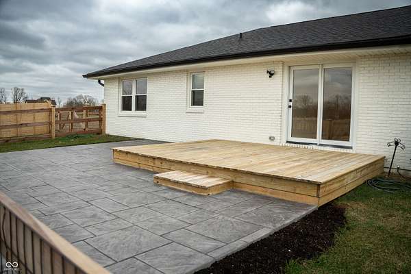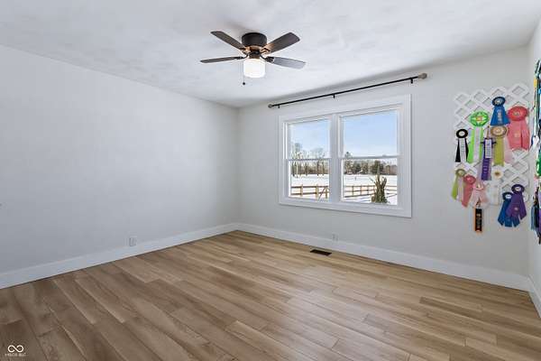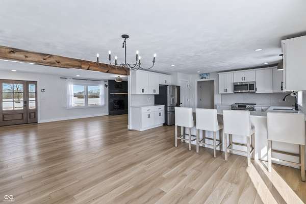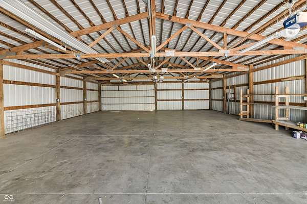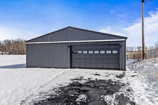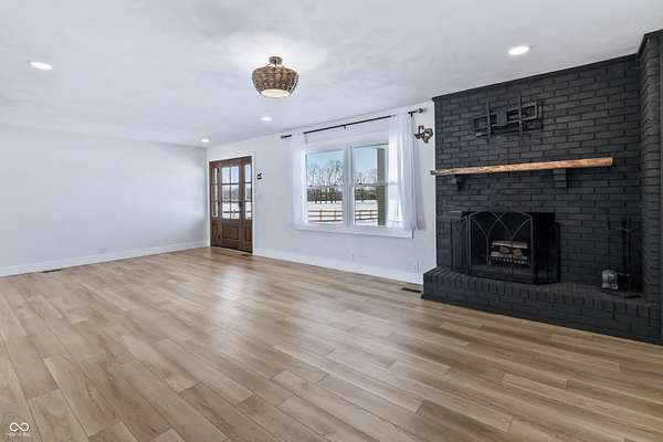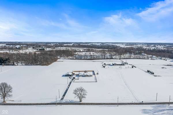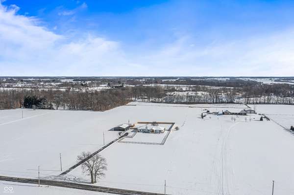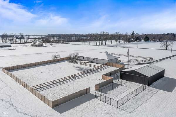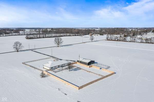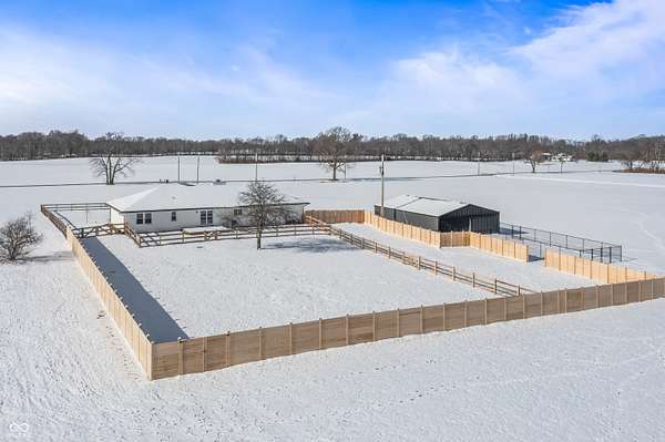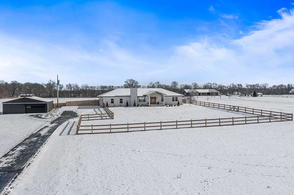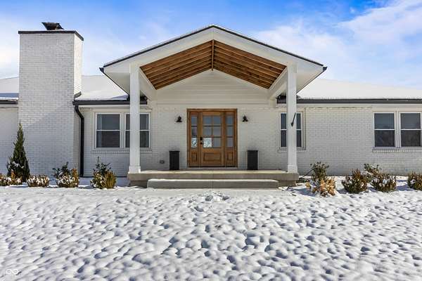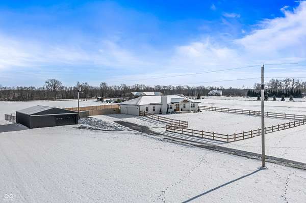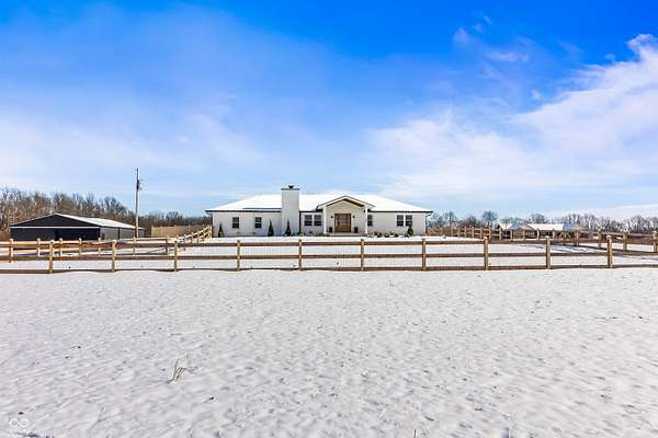 Wow! This 3 bed / 2.5 bath ranch has been completely updated and offers 3,485 square feet, including an unfinished basement, a 36'x48' pole barn, all-new fencing (front and back), and sits on 8 acres with no HOA! A paved driveway leads to a beautiful front approach featuring updated landscaping, a brand-new covered porch with vaulted ceilings, and a stunning new front door. Inside, the light-filled living room showcases a painted brick fireplace as its focal point. The open floorplan allows each space to flow seamlessly, enhanced by luxury vinyl plank flooring and accented with a warm wood beam. The kitchen offers abundant counter space, tile backsplash, breakfast bar, shaker cabinetry, pantry storage, and stainless steel appliances. Just off the kitchen-and connecting to the garage with epoxy-is a newly added laundry/mudroom with extra storage, work space, and utility sink, plus a brand-new half bath conveniently located nearby. All three bedrooms are situated on the opposite side of the home, each with generous closet space and ceiling fans. The primary suite features a tiled walk-in shower and vanity, while the second full bath is centrally located between bedrooms two and three. The basement offers over 1,600 square feet of unfinished potential-ready to configure to your needs. Outdoors, enjoy a newly built back deck and fire pit overlooking peaceful country views. The sellers have recently added over $30,000 in privacy fencing, ideal for a pool, pets, livestock, or other uses. The 36'x48' pole barn includes a concrete floor and 100-amp service, providing incredible storage, additional parking spaces or workspace flexibility. You'll also enjoy additional clean acreage behind the home to utilize however you wish. All of this sits in a beautiful rural setting just minutes from Pendleton Schools, downtown Pendleton, and convenient access to Indianapolis. Don't wait-this remarkable property is a must-see!