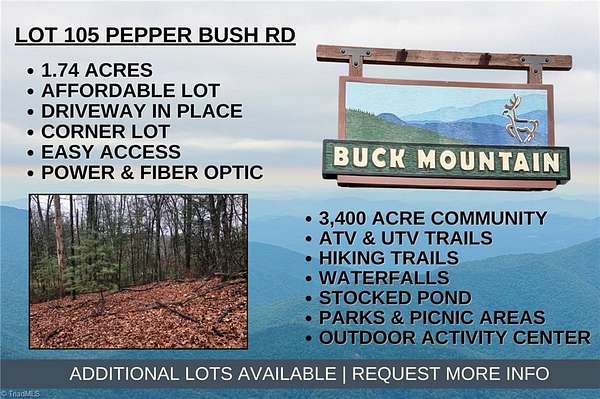 AFFORDABLE BUILDING LOT 1.74 acre corner lot with gravel driveway in place. Located in the 3,400 acre Buck Mountain community...ONLY GATED ATV COMMUNITY in Wilkes County. Easily accessible lot. Build your weekend getaway or vacation rental property here! Work from home! Fiber optic available. Potential mtn view w/tree trimming. Long & short-term rentals allowed. Escape the stress of daily life by surrounding yourself w/abundant wildlife & soothing sounds of nature. Just minutes from High Country activities. Buck Mtn is a prime location! Arrive at the gate from Winston in only 1 hour & from Charlotte in 1 hour 40 min. Close to BLUE RIDGE PKWY, ASU, shopping, dining, golf, mtn biking & skiing. Buck Mtn has hard to find amenities like ATV & Hiking Trails, Parks, Fishing Pond, Water Falls, Pavilions, Community Ctr, Helipad, Outdoor Activity Center with Amphitheater for live music and more! Make lasting memories while hiking or riding ATVs on the miles of trails.