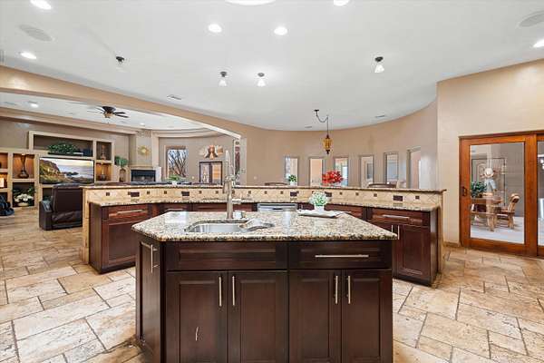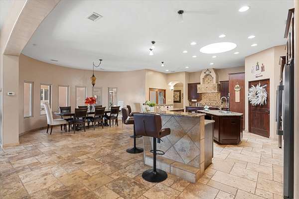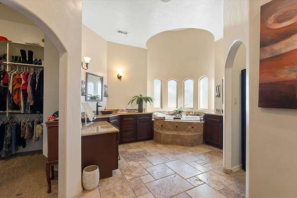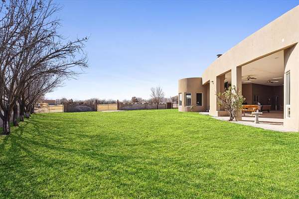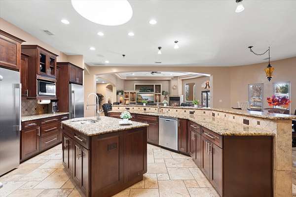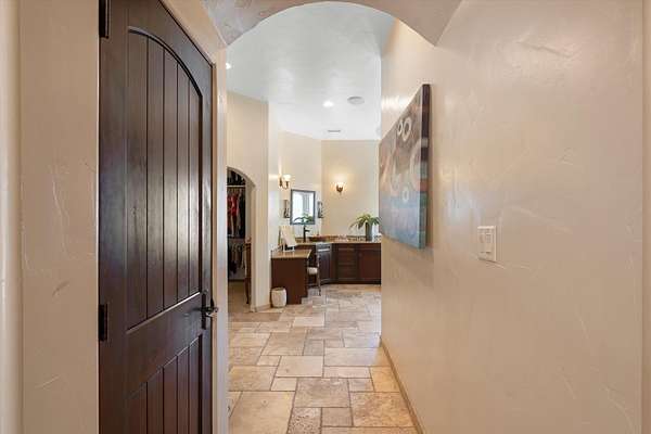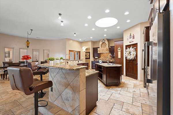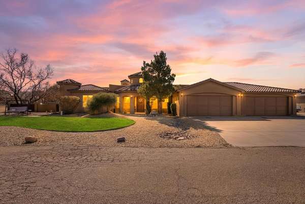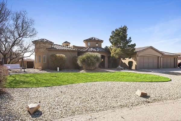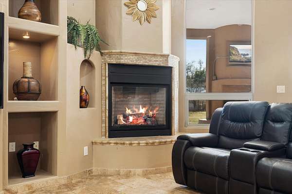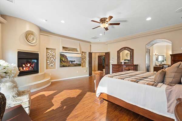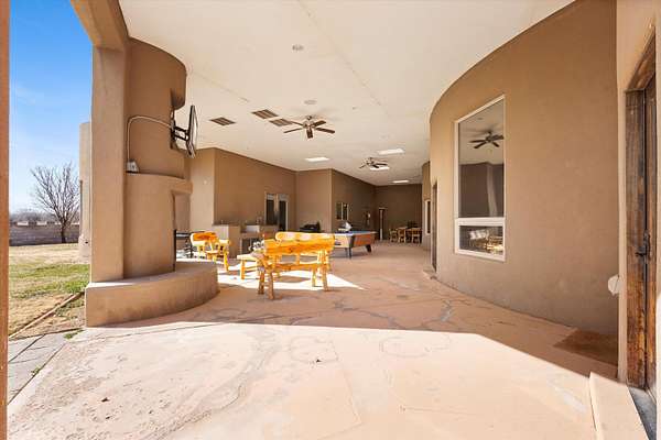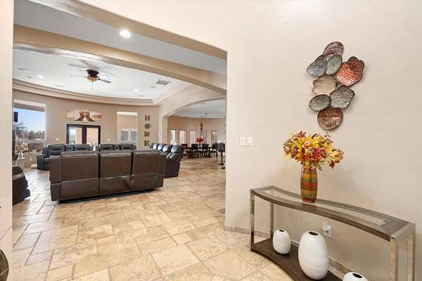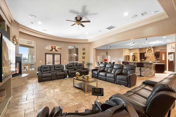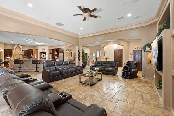 Set within a quiet, private gated community in the Town of Peralta, this estate offers over 5,500 total sq ft, 5 bedrooms, 4 full baths, and an oversized 4 car garage. Arrive to a grand foyer entry that sets the tone for the home's architectural detail and thoughtful built-ins. In the living room, a rounded, stepped tray ceiling and Venetian plaster add dimension, while custom built-in shelving throughout keeps spaces polished and intentional. The chef's kitchen anchors daily living and entertaining with oversized luxury granite countertops, dual fridge space, and a chef's sink with a built-in colander designed for real prep, not just display. Movie nights become an occasion in the dedicated theatre room with a built-in bar, and the home's barrel hallway ceilings and (more)