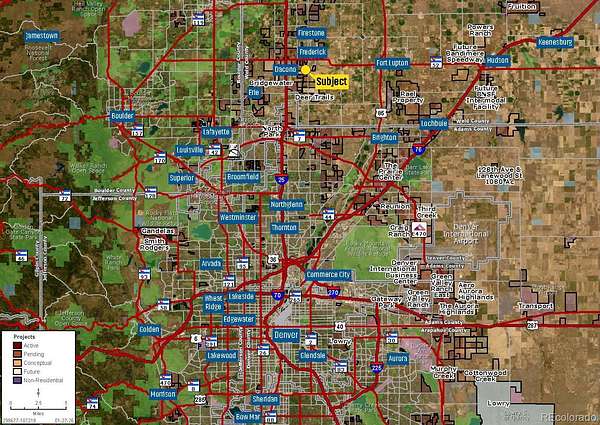 This 6.5-acre commercially zoned parcel is in the heart of Dacono’s development activity. With thousands of future homesites surrounding the parcel on all sides, the site is positioned for an efficient development with strong visibility and access, and its flexible footprint and zoning allow for a myriad of uses and layouts to meet tenant and resident demand. With daily commuter traffic steadily increasing, the property supports multiple development strategies, including convenience-oriented retail, dining, professional office uses, and light industrial applications. Limited nearby commercial supply creates a first-mover advantage, with upside potential as the population grows around the property and demand for local services increases.