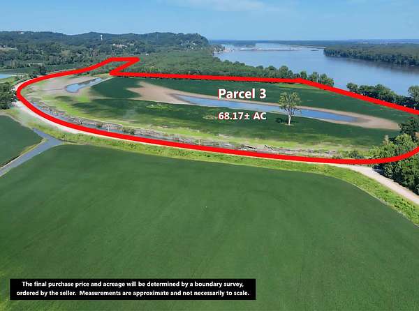 This property will be sold by Online Only Auction to begin on Thursday October 23 and end on Thursday October 30 at 7:00pm CST. THE LIST PRICE IS ONLY TO COMPLY WITH THE MLS AND IS THE SUGGESTED OPENING BID. THE PROPERTY WILL SELL FOR MORE THAN THIS PRICE. Successful bidders will be required to put 10% of the total contract price. The remaining balance will be due at closing with closing on or before 30 days. 5% Buyer's Premium. Very rare opportunity to buy prime tillable Mississippi river bottom land! Up for auction in Clarksville MO..... 196+- acres of highly productive row crop with some of the most alluvial soil in the world. The property will be sold in 3 tracts that are known for their exceptional nutrient content and moisture retention. Located in one of the most sought after waterfowl migration areas in the United States the property has numerous locations for hunters to place their blinds for excellent hunting. With Highway 79 and county road access the gently rolling hills and numerous successful farming operations make this property a perfect income producing invest that will retain and increase in value for many years to come. The final purchase price and acreage will be determined by a boundary survey, ordered by the seller. Measurements are approximate and not necessarily to scale. Parcel 1 - 113.15+- Acres Parcel 2 - 15.32+- Acres Parcel 3 - 68.17+- Acres