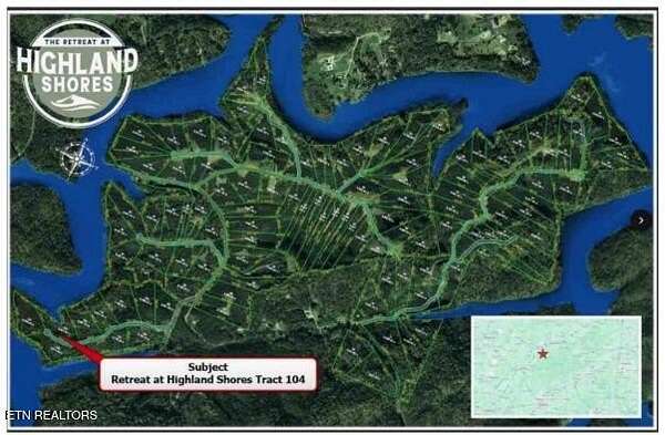 From Knoxville, take US-129 S (Alcoa Hwy) toward Alcoa/Maryville. Keep right to stay on US-129 S/US-411 S and continue into Vonore. Turn left onto TN-360 S/Unicoi Turnpike for 7.2 mi, then right to stay on TN-360 S for 3.5 mi. Turn sharp right on King Ln (0.9 mi), left on Boiling Springs Rd (0.4 mi), then right on Three Point Rd (3 mi). Turn left on Lindsay Cemetery Rd into Highland Shores. Left on Pineview Way, Lot 104 is at the end on the right. Sign on lot.