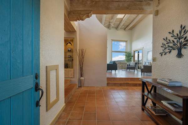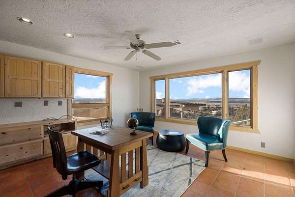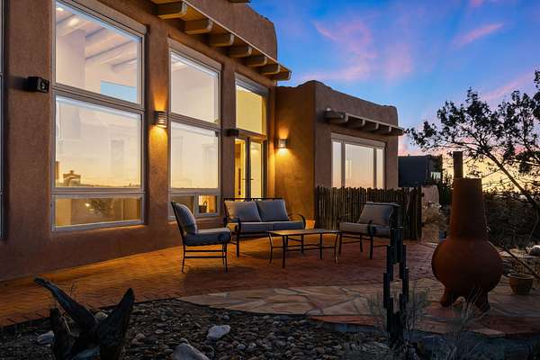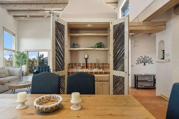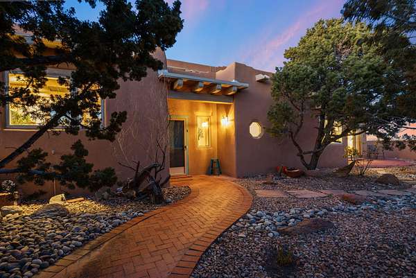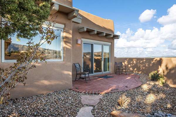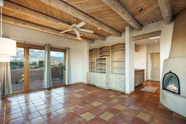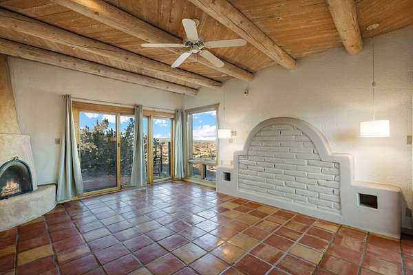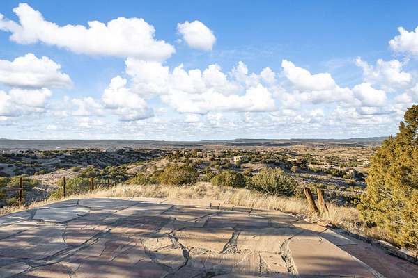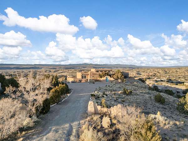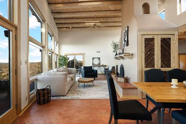 Experience the spirit of New Mexico living in this beautifully crafted Southwestern home on Calle Ponderosa in Placitas on 3 acres. Filled with regional character, the home showcases viga-beam ceilings, custom kiva fireplaces, brick and Saltillo tile flooring, and warm, natural finishes that create an inviting, timeless atmosphere. Large windows throughout the home capture the serene desert surroundings and amazing mountain and mesa views while filling each room with natural light. The kitchen has custom cabinetry and granite countertops. Its open layout connects the kitchen to the dining and living areas, making it ideal for entertaining or simply enjoying the home's natural flow. This home has a basement with its own bathroom, offering exceptional versatility.