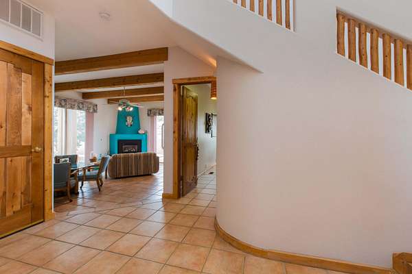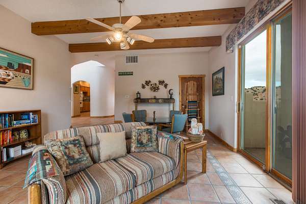 Enjoy classic Placitas living in this 4BR home set on 2.59 acres with sweeping mountain views. Features include 2 living areas with kiva fireplaces, wood beam ceilings, and warm Southwest finishes. The spacious kitchen offers granite countertops, abundant storage, new 5 burner range & Bosch dishwasher (2025), breakfast nook, bar seating, and formal dining. The primary suite is a true retreat with two balconies and sweeping views, a large walk-in closet, and a luxurious bath with jetted tub and separate shower. Two updated bathrooms showcase granite counters and vessel sinks. Three additional bedrooms and 2 full baths plus a 3/4 bath provide flexibility for guests or office space. Enclosed patio, 3-car garage bays, and 2 refrigerated air HVAC units (2021 & 2025) for year-round comfort.