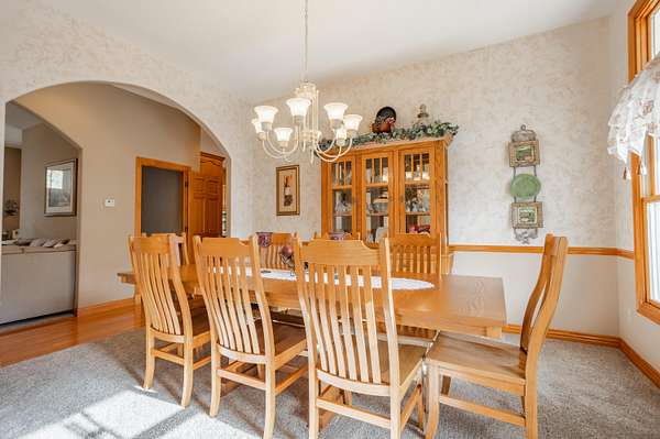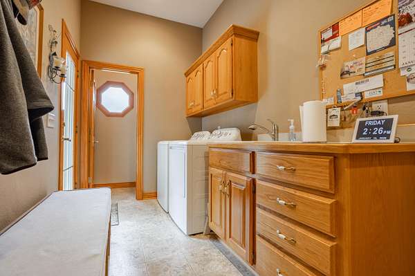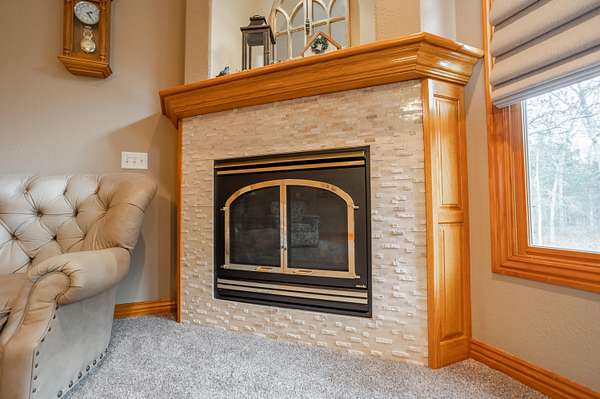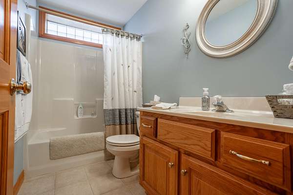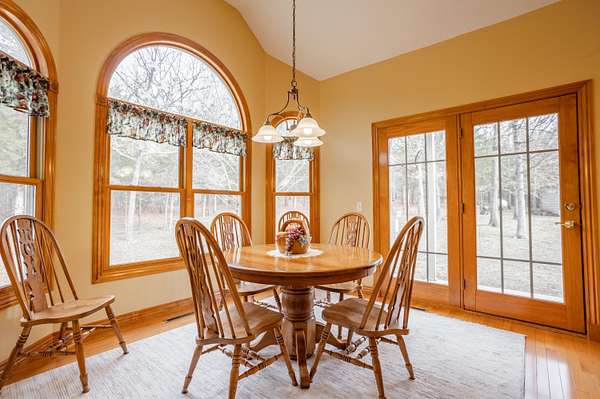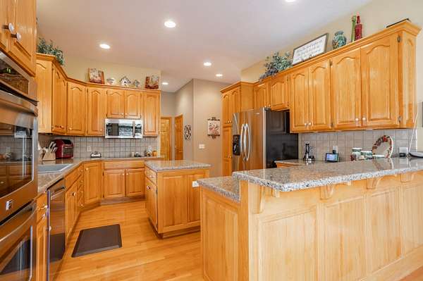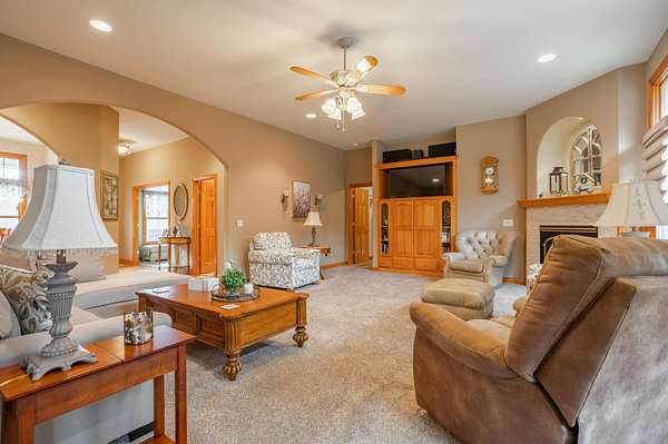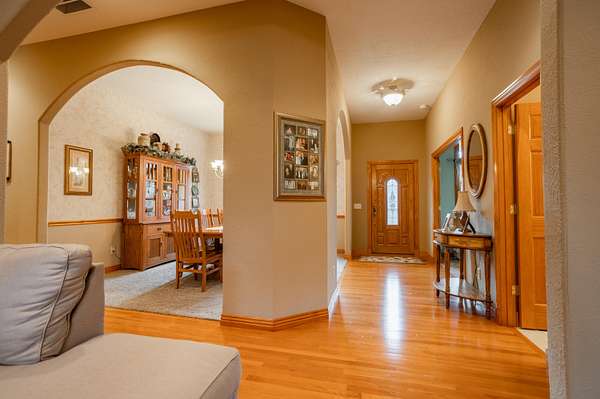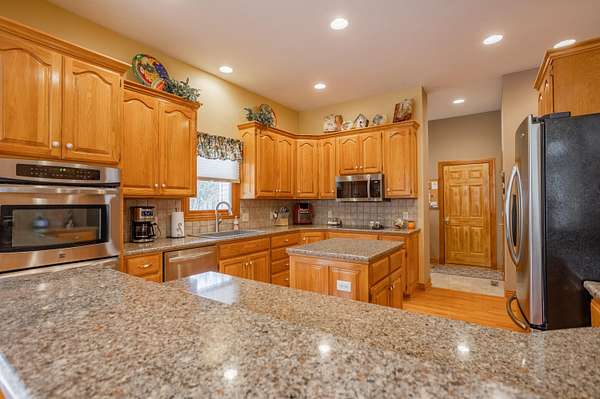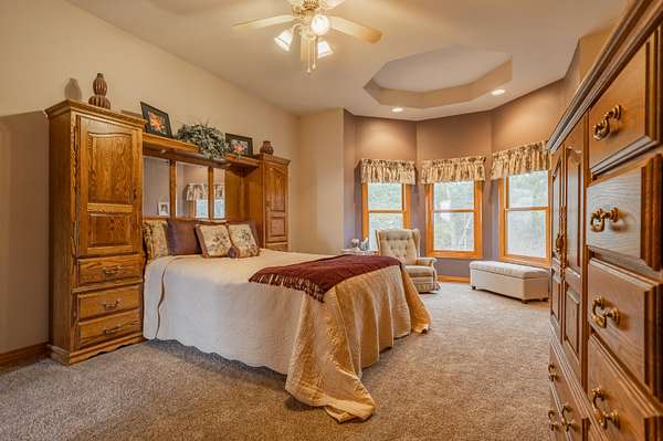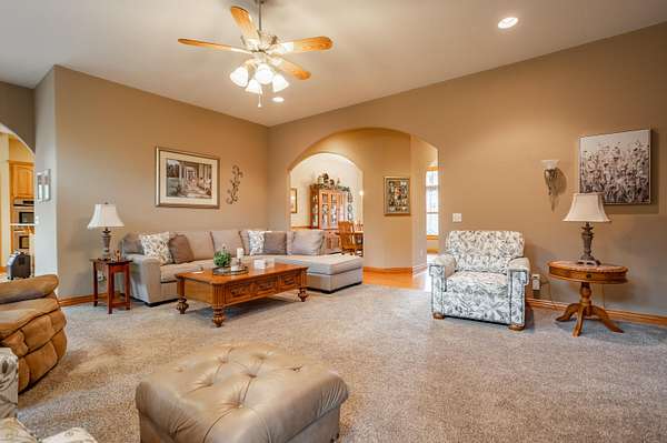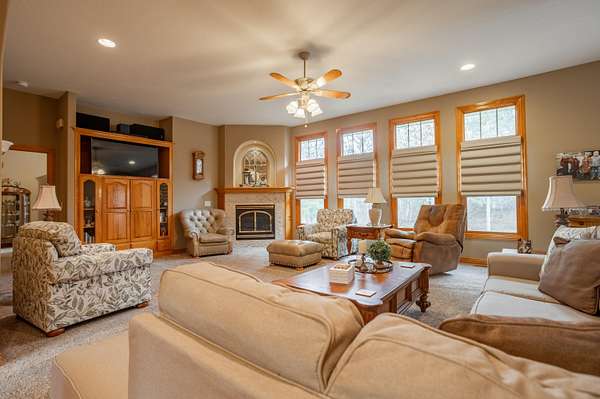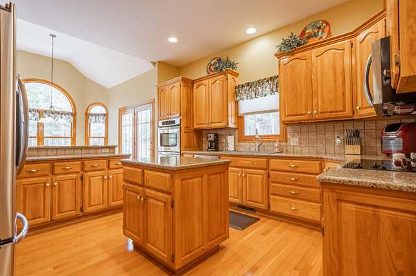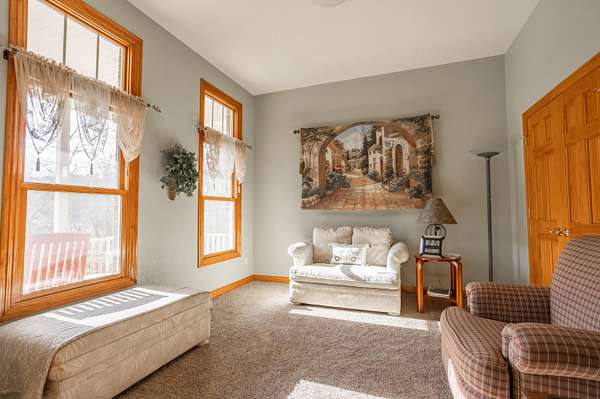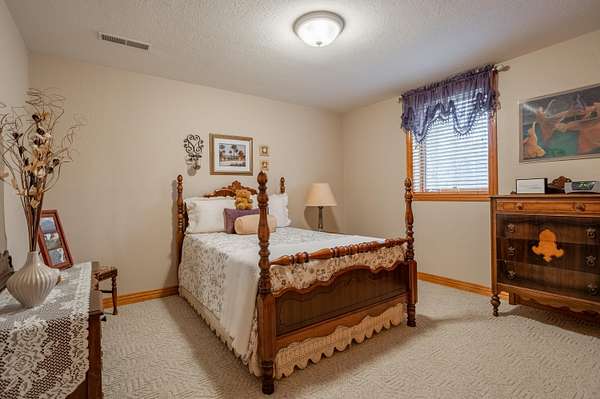 Tucked away on a quiet Greene County-maintained road, this one-owner, custom-built home sits on 7.4 beautifully wooded acres and offers exceptional craftsmanship, privacy, and timeless design. The exterior features a large covered front porch, a side porch extending to a stamped concrete patio, mature trees, and established landscaping, creating a serene, park-like setting. Even electrical outlets in the soffit for your holiday lights!Inside, high ceilings, abundant natural light, custom woodwork, and six-panel doors define the home. The main level includes custom hardwood flooring, a primary suite, and a second bedroom. The living room boasts soaring ceilings, arched doorways, a gas fireplace, custom cabinetry, double-stacked windows, and electric shades. The chef's kitchen features granite countertops, an island, ample custom cabinetry, and a full appliance package with double oven, cooktop, microwave, dishwasher, and refrigerator, plus a breakfast bar and dining area.Additional details include a utility room with custom cabinets, a deep sink, half bath, garage access, and exterior soffit outlets. The primary suite offers a sitting area surrounded by bay windows. The primary bath includes a double vanity, soaking tub, walk-in shower, and spacious closet.The finished basement provides plush carpeting, matching woodwork, a large open area for theater or recreation, a craft/work room, storage, and a storm shelter.Meticulously maintained, this home combines superior construction, thoughtful design, and rare privacy--truly a standout property.