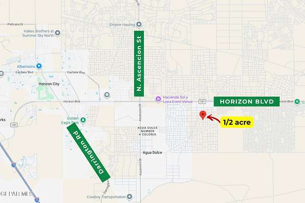 Great opportunity to own approximately 1/2 acre of land in the rapidly growing Horizon City area! This spacious lot is located just off Horizon Blvd and near N. Ascension St, offering convenient access while still providing privacy. Situated less than a mile from Horizon Blvd, this property provides easy access to shopping, dining, schools, and major thoroughfares including Eastlake Blvd and Darrington Rd. Nearby amenities include local retail centers, restaurants, and essential services, making this an ideal location for future development. Whether you're looking to build your custom home, invest in land, or secure property in a developing area, this half-acre lot offers excellent potential. With continued growth expanding eastward in Horizon City, now is a great time to invest. No Survey will be provided by seller. Owner May Carry.