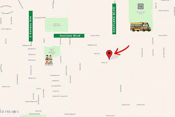 Fantastic opportunity to own residential land in the growing Horizon City area! This spacious lot (25,000+Sqft) is conveniently located just off Horizon Blvd and Eastlake Blvd, providing easy access to major roads, schools, shopping, and daily amenities. Situated near Horizon High School and Carroll T. Welch Elementary, this property offers a great location for a future homesite. The lot is tucked away on Gerry Ct, offering privacy while still being close to established neighborhoods. With new development continuing throughout Horizon City, this is a great opportunity to build your custom home or invest for the future. No Survey will be provided by seller. Owner may carry. Google coordinates 31 degrees 40'45.0''N 106 degrees 10'30.0''W
