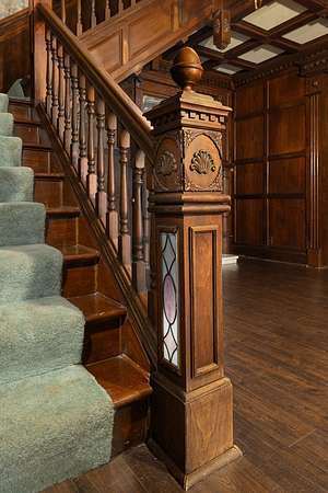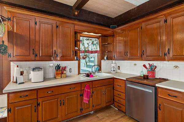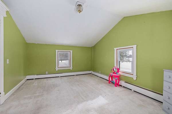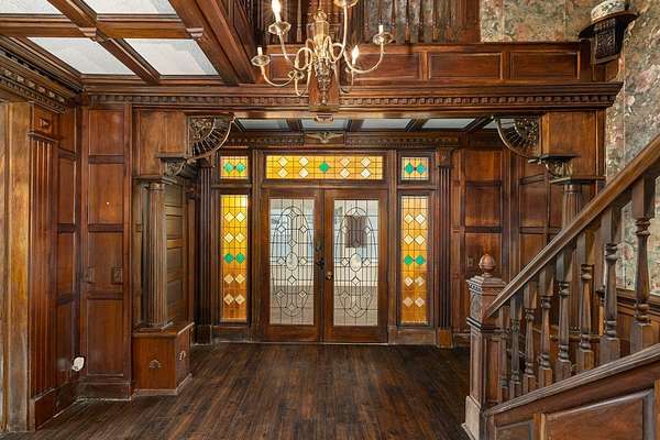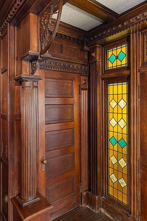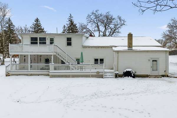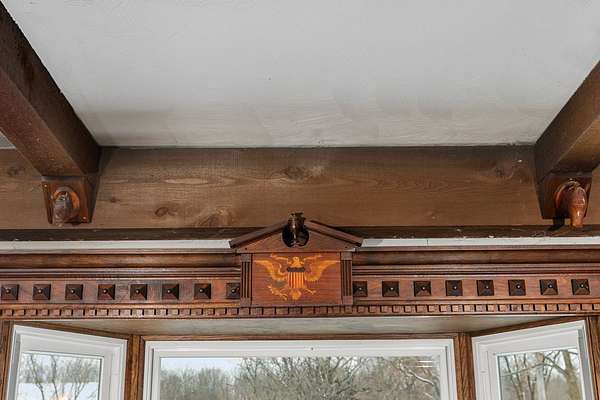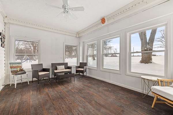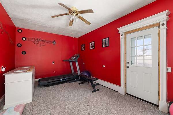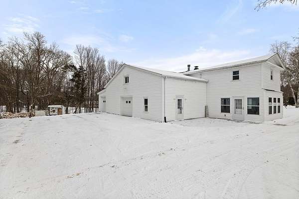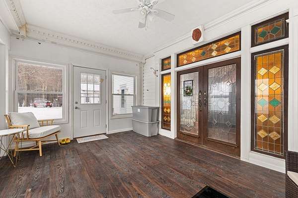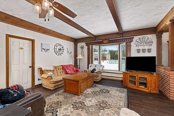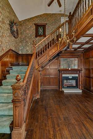 Come experience this rustic appeal on 7.76 private acres of woods, a creek, and a large yard with an above-ground pool. This 4-bedroom, 2-bath retreat blends rural serenity with a short commute to town. Inside, a grand foyer with stained glass leads to a lodge-like interior boasting rich dark woodwork, a magnificent staircase, and natural exposed beams. Hand-carved wooden figurines throughout add unique character to the extra-large rooms, which include a dedicated exercise room. The property is a hobbyist dream, featuring a heated detached garage/shop and a 22x22 cabin in the woods with power, perfect for a studio or guest retreat. Surrounded by peaceful farmland, this home offers the ultimate sanctuary for those seeking character and space!