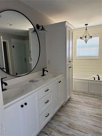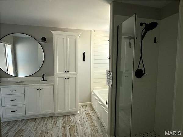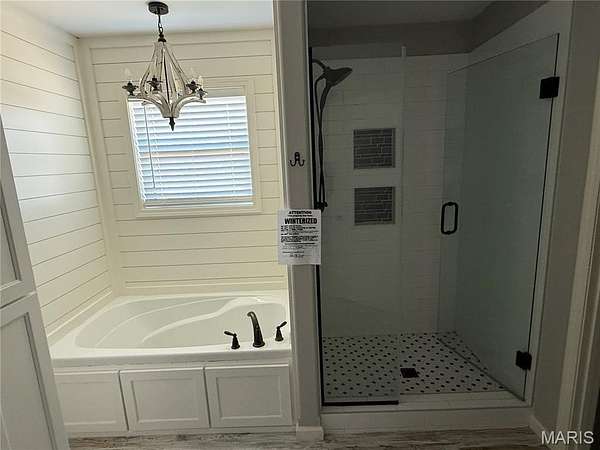 The layout includes three bedrooms and two full bathrooms. The primary suite is a standout with a custom walk-in shower with glass doors, built-in shelving, and a luxurious soaking tub under a subtle chandelier. One of the secondary bedrooms is currently configured as an oversized walk-in closet -- easily converted back to a traditional bedroom to suit your needs.