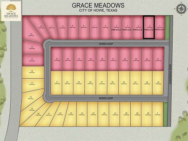 PRE-SALE $5,000 Buyer Incentive. Discover Grace Meadows, a brand-new boutique community in North Dallas, offering spacious 51 half-acre lots at an unbeatable value. Located in Howe, TX--just 30 minutes from McKinney and Celina and minutes from Sherman, Van Alstyne, Melissa, and Anna--Grace Meadows gives you the freedom to build your dream home while staying close to major conveniences and thriving city centers. Crafted by Malachi 310 Construction, this thoughtfully planned development will feature newly paved concrete streets and NO HOA, PID, or MUD! Whether you're looking to bring your own builder or prefer the simplicity of selecting a beautifully designed Craftsman or Farmhouse-style home with our available spec homes, Grace Meadows is the perfect place to call home.
