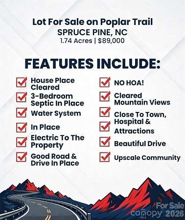 Your brand-new home place has been carved out on a mountain in Spruce Pine, NC at the top of Poplar Trail- part of the Holly Dale Lands, adjacent to Little Switzerland and just off the Blue Ridge Parkway in the greater Dale Road Community- an area that is exploding with the nicest of homes for working professionals and retires alike. THIS IS THE PLACE TO BE! This 1.74 Acre view lot is 100% READY for your build! You have a brand new 3 bedroom septic in place, community water ready for hook-up, electric to the property, well built and graveled drive, along with well maintained community roads, hydro seeding in place, cleared mountain views, and NO HOA! Your drive in to the property brings you across the "Rusty Spur Farm" which is a working mountain equestrian/cattle farm at the bottom of the mountain and features a beautiful pastoral scene of horses and the occasional mischievous calf that gets through the fence on occasion. It is drives with scenes like this that are more and more rare these days as society outside these mountains progresses. IF YOU APPRECIATE magnificent mountain scenery and the companionship of people with broad interests; If you would like to live or vacation clean and pure- where you can enjoy, but avoid most of the annoyances of urban, suburban or commercialized resort areas, perhaps you should join the interesting folks who have chosen to build their permanent and/or vacation homes and legacy in this area of our ancient mountains. Your neighbors in this community are people of achievement in their respective professions and businesses- of good taste, with a wide variety of creative interests. Here, at Holy Dale Lands Inc., you can build a beautiful year-round residence, or a vacation retreat at less cost per square foot than in most other sections of the country. You do have deed and value protections, in the way of some light community covenants, but there is NO HOA! Also, it's important to acknowledge: THE DEGREE OF FREEDOM IS HIGH, & PROPERTY TAXES ARE LOW! The emphasis here is on enjoyment of one of the most beautiful mountain regions in the entire world; on simple forms of outdoor recreation; on clean mountain living; on companionship with interesting people, and small town schools and sports- as well as complete privacy when desired. The Holly Dale Lands Community is approximately mid-way between New York and Florida, and is easily one days drive from 60% of the entire US population- New York, Philadelphia, Washington D.C., New England, Florida and the Mid-west. No matter the road you take, to or from here, it's always the "scenic route!" This ridge top awaits your legacy- your family's crest or shingle is ready to be erected here in this small town enclave. You are just 5 minutes away from downtown Spruce Pine, The Grassy Creek Golf and Country Club, and the Blue Ridge Regional Hospital; 5 minutes to the Blue Ridge Parkway and 10 minutes to the Linville Falls Winery- perfect for wine, music and weekend relaxation; 15 minutes aways from the famous Penland School of Crafts; You will be 15 minutes to downtown Burnsville, or 30 minutes to fine dining, ski resorts and other entertainment at Banner Elk, Beach Mountain, and Sugar Mountain, as well as Mountain Glen Golf Course in Newland; 20 minutes to Lake James, Marion, and I-40; 50 minutes to Asheville, NC; 60 minutes to Johnson City, TN, and the Tri-Cities Airport. This community is two hours from Charlotte, NC.