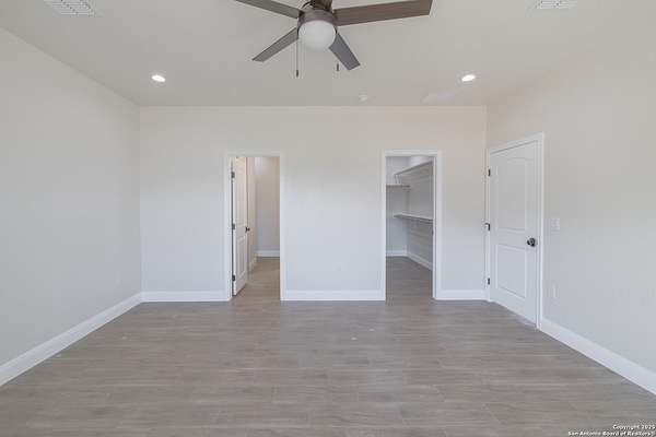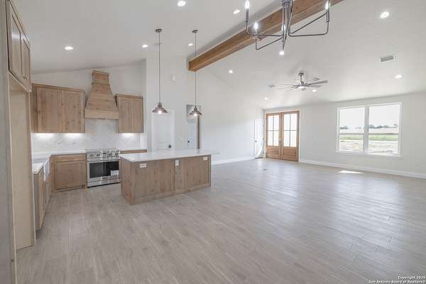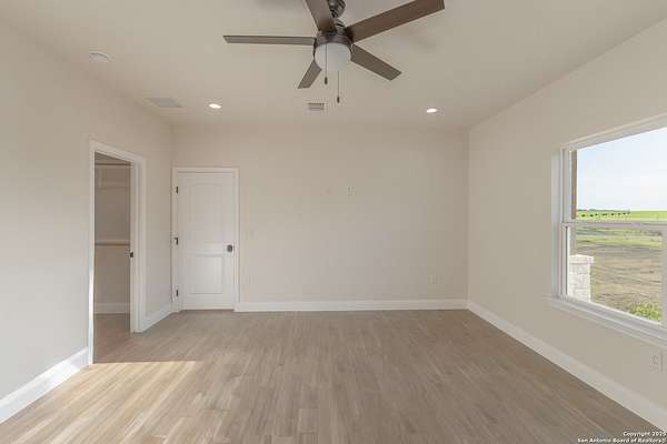 This beautifully crafted custom home on acreage sits on 1.5 acres and offers nearly 2,000 square feet of living space with 3 bedrooms and 2 full bathrooms. This Texas custom-built home features custom shaker-style cabinets, soft-close drawers, quartz countertops, and wood-look tile flooring throughout, delivering both style and durability. The open-concept living area boasts soaring 15+ foot ceilings with a cathedral ceiling design, creating a spacious and inviting atmosphere ideal for entertaining and everyday living. The split floor plan provides privacy, with the primary suite on one side of the home and secondary bedrooms on the opposite side. Built for long-term performance and comfort, this energy-efficient home includes high-performance windows, Hardie siding, 30-year architectural shingles, and a Carrier HVAC system, ensuring efficiency and comfort year-round. The home is also well insulated and features custom-tiled showers and quality finishes throughout. With limited neighboring homes, expansive surrounding acreage, and over 300-acre neighboring properties, this home offers peaceful country living, privacy, and scenic sunrise views, while still providing convenient access to nearby amenities. A perfect opportunity for buyers seeking a modern farmhouse, new construction on land, or a luxury country home with space, privacy, and efficiency.