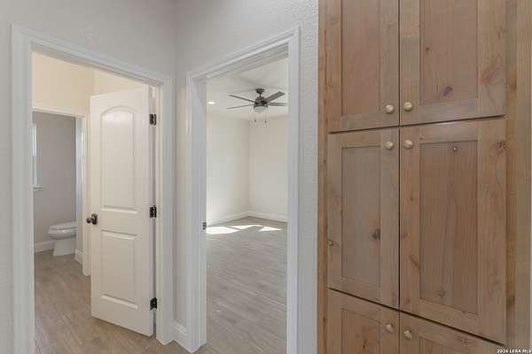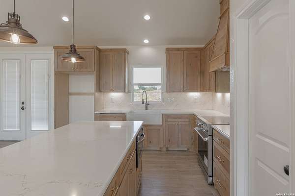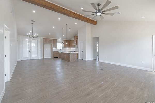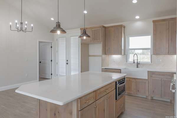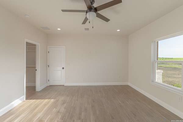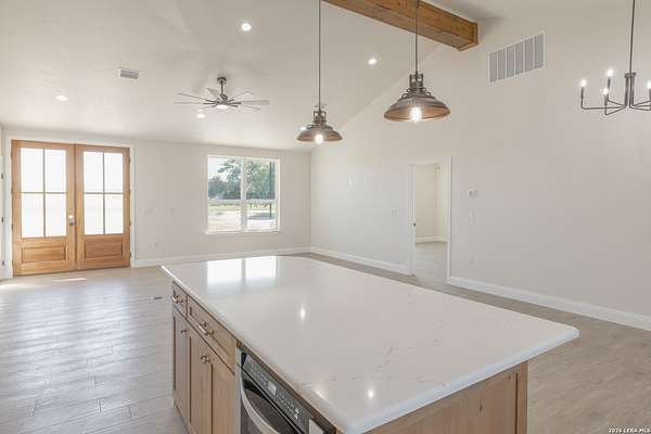 This beautifully crafted custom home on acreage sits on 1.5 acres and offers nearly 2,000 square feet of living space with 3 bedrooms and 2full bathrooms. This Texas custom-built home features custom shaker-style cabinets, soft-close drawers, quartz countertops, and wood-looktile flooring throughout, delivering both style and durability. The open-concept living area boasts soaring 15+ foot ceilings with a cathedralceiling design, creating a spacious and inviting atmosphere ideal for entertaining and everyday living. The split floor plan provides privacy,with the primary suite on one side of the home and secondary bedrooms on the opposite side. Built for long-term performance and comfort,this energy-efficient home includes high-performance windows, Hardie siding, 30-year architectural shingles, and a Carrier HVAC system,ensuring efficiency and comfort year-round. The home is also well insulated and features custom-tiled showers and quality finishesthroughout. With limited neighboring homes, expansive surrounding acreage, and over 300-acre neighboring properties, this home offerspeaceful country living, privacy, and scenic sunrise views, while still providing convenient access to nearby amenities. A perfect opportunityfor buyers seeking a modern farmhouse, new construction on land, or a luxury country home with space, privacy, and efficiency.