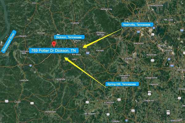 From downtown Dickson, East on E College St, Right on Church St (TN-48 S). Go 8.8 mi, Right on Harris Hollow Rd. Go 1.6 mi, Right on Garners Creek Rd. Go 1.1 mi, Left on Potter Rd property on left with sign.