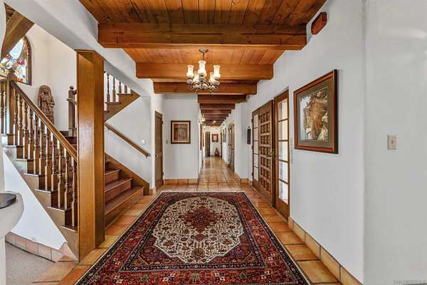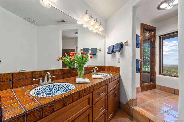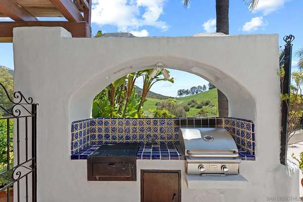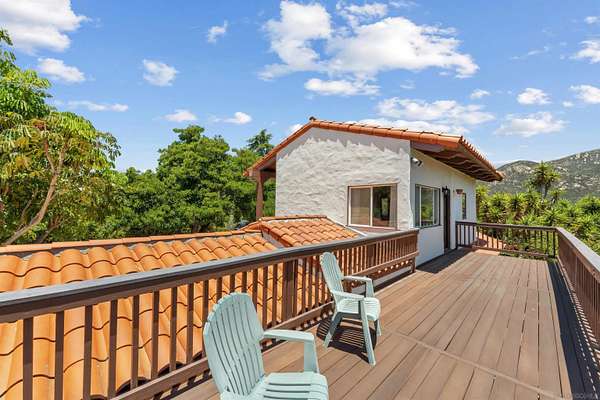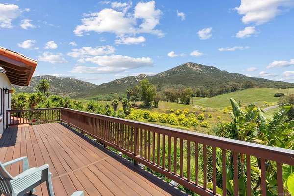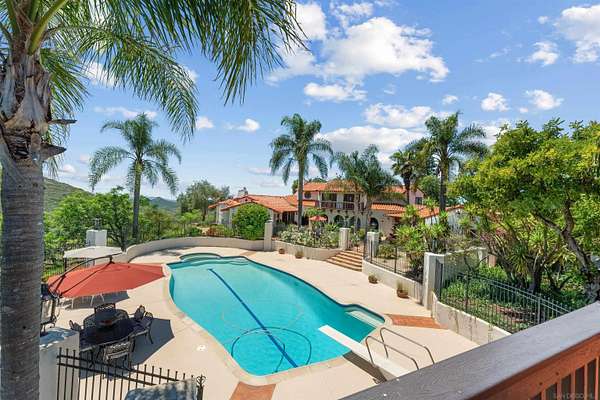 Where the the trail ends, your dream begins with this 16-acre estate, rich with Spanish architectural influence and San Diego charm. True pride of ownership and craftsmanship are evident throughout this custom, one-of-a-kind property designed by Rodger Mohling. Perched atop a private mountain, the estate offers breathtaking 360-degree views-lush greenery surrounds the main home, with panoramic mountain vistas from every room. On clear days, you can even catch beautiful views of the ocean, downtown lights, gorgeous Catalina Island, Point Loma, and feel the refreshing San Diego breeze. The main residence features 4 spacious bedrooms, plus a maid's quarters with its own 1 bedroom and 1 bathroom. The living spaces downstairs feature a dining area and formal sitting area with plenty of windows to take in the view of the gorgeous countryside and carefully curated landscaping. A second sitting area with a view of the courtyard makes a perfect music or art room. A beautifully detached guest house offers even more space with 2 bedrooms and 1 bathroom upstairs, and a gym, sauna and bathroom downstairs. Ideal for those who appreciate authentic architecture and serene country living, this estate also includes a pool and built-in BBQ area, a fenced horse corral and pasture, as well as a private tennis/pickleball court-bringing both relaxation and recreation to your doorstep. This home is perfect for those who seeking a custom, resort style space with plenty of amenities to keep you entertained year round.Ideal for multi generations to reside and live together.