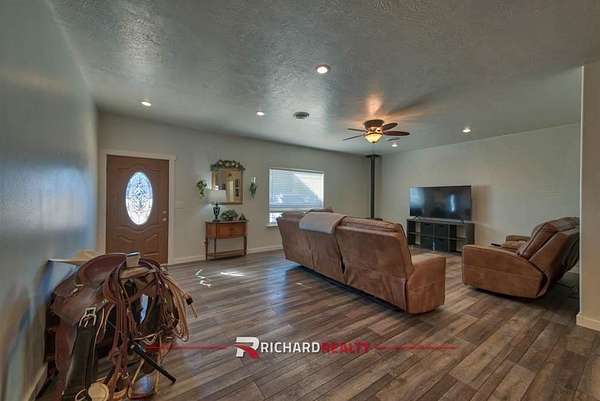 An attached RV garage sets this Powell-area property apart, offering generous space for larger vehicles, campers, or recreational equipment along with additional storage and workspace. Inside, the home features a comfortable single-level layout with a bright living area and gas fireplace for a cozier feel on cold Wyoming days. There is an easy flow between the kitchen, dining, and living spaces. Outside, the property offers space to enjoy Wyoming living with a designated garden area, a hobby shed with electricity, and a horse corral, providing opportunities for gardening, projects, livestock, and other outdoor use as it has no covenants and no HOA. Located just outside of Powell in Park County, the property offers convenient access to town as well as the surrounding Big Horn Basin with Yellowstone National Park and the many outdoor recreation opportunities of Northwest Wyoming within reach.
