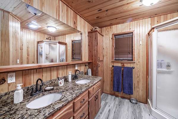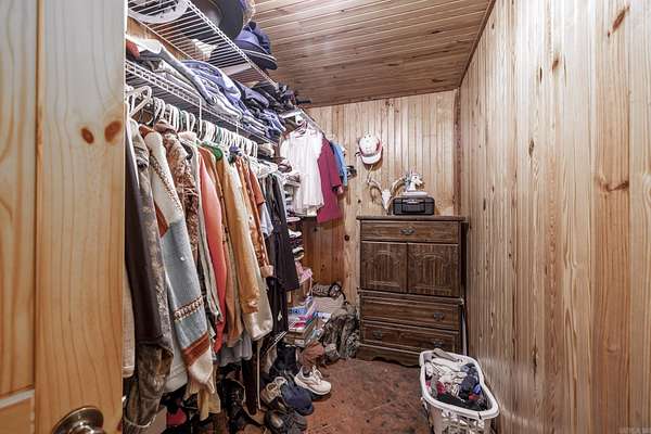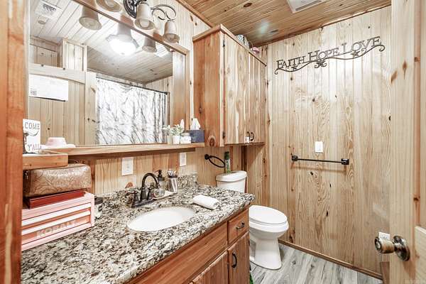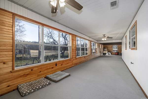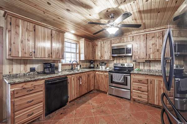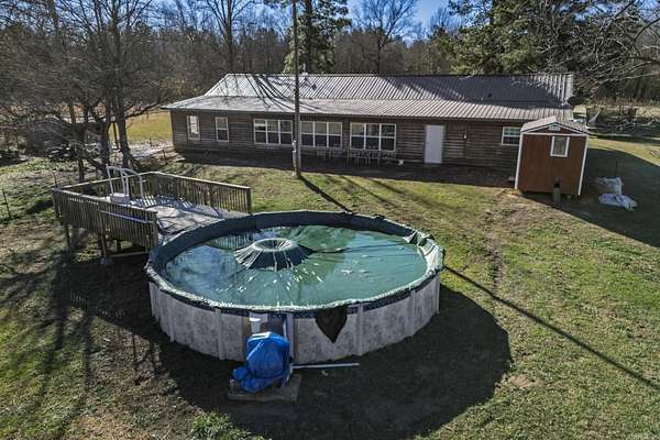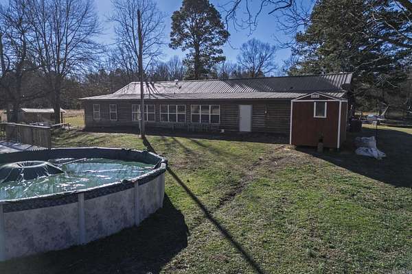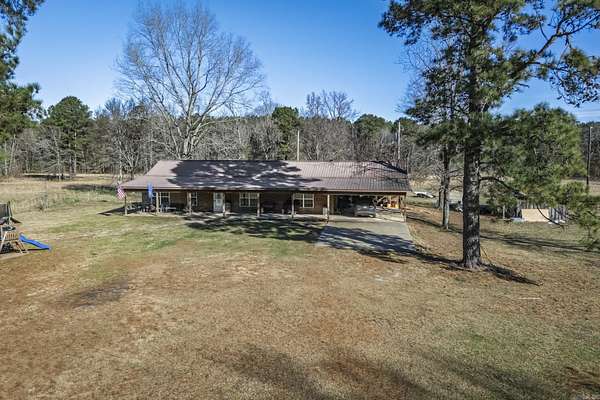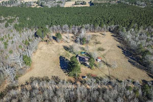 Tucked away on a peaceful stretch of countryside, this well-maintained rural retreat offers space, privacy, and classic charm. The home features warm wood-paneled walls and ceilings throughout, creating a cozy lodge-like feel. The open living area flows into a spacious kitchen and dining space with ample cabinetry, granite countertops, and stainless appliances--ideal for gatherings. Multiple ceiling fans, recessed lighting, and large windows provide comfort and natural light. The primary bedroom is generously sized with easy access to a large bathroom featuring dual vanities, granite counters, and a walk-in shower. Additional rooms offer flexibility for guests, office space, or hobbies. A long enclosed sunroom provides excellent bonus space for relaxing, entertaining, or storage. Outside, the property opens to beautiful pasture and wooded views, highlighted by an above-ground pool with deck, outbuilding for storage, and expansive acreage offering endless possibilities for recreation, animals, or future improvements. Conveniently located near Prescott with easy access to I-30, this property combines quiet country living with accessibility.