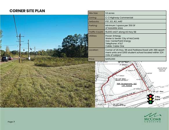 For sale is a prime 1-acre commercial land parcel in McComb, MS, strategically located just off the I-55 south exit for $435,600. This site offers exceptional visibility and high traffic counts, making it ideal for new businesses. Zoned as an Opportunity Zone, it promotes investment and growth, with direct access to I-55 ensuring excellent exposure. Comprehensive traffic data is readily available, and all necessary utilities are accessible, facilitating easy development. Situated near existing businesses and amenities, this land presents a fantastic opportunity for retail, restaurants, and service-oriented ventures. Don't miss the chance to establish your presence in this thriving area-contact us today for more information or to schedule a viewing!