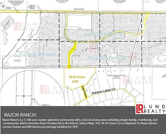 Motivated Seller! Bring Your Offer! HARD TO FIND INVESTMENT OPPORTUNITY IN CELINA! AT $102,000 Per Acre. A HIGHLY SOUGHT AFTER CELINA ISD! Sanitary Sewer and Water! 34.24 Acres Previously Owned by Jerry Jones' Blue Star Only Two Grantors Down The Chain of Title. This Tract is Perfectly Nestled Between Preston Rd, Celina Pkwy, and Dallas Tollway! At the Prestigious Preston Lakes Community With Sprawling Spacious Estates Through Its Expansive Acreages. The Access is Through Preston Lakes and Through Abutting Rasor Ranch, a Major Planned Development. Phase I of Rasor Ranch Is Undergoing Construction. Flat pasture,