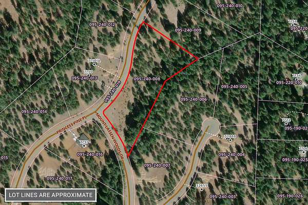 State Hwy 44 east. 3 mi past Shingletown, left at the rock entrance of Mt Lassen Pines. Lot is on corner of Princess Pine and Mt Lassen Woods Dr.