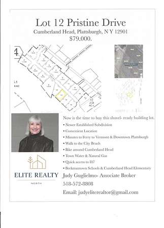 Rte 9 north from Pittsburgh. Take a right toward the Ferry on Cumberland Head. Take a left on Cumberland Head Rd. at the light near the Fire Station.After the big turn, Pristine Dr. will be on your right.Lot is on the right. Look for sign.