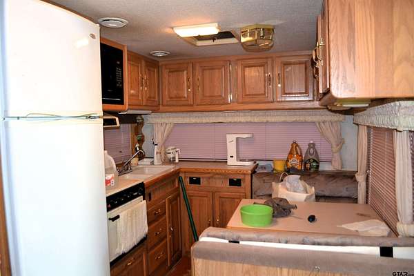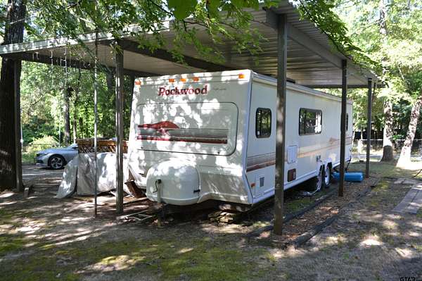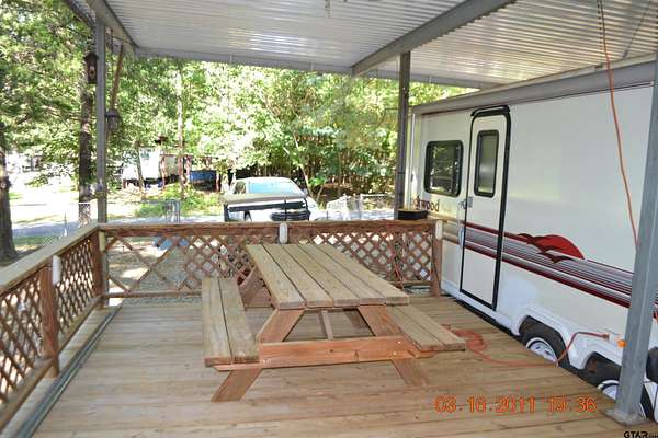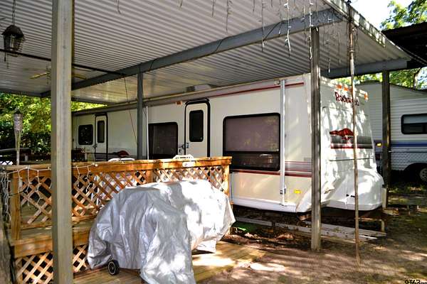 Two fenced lots in Sun Eagle Bay offer the perfect weekend escape or affordable Lake Fork retreat! This property includes a well-kept 1991 Rockwood Royale RV that's been protected under a metal awning and features a queen bed, sofa, chair, breakfast table, built-in microwave, and an upgraded full-size refrigerator and freezer. Step outside to enjoy a spacious covered wood deck with a picnic table, ceiling fan, and plenty of shade from tall, manicured trees. The two lots are fully enclosed with chain link fencing for privacy and security. A storage shed and outdoor grill add functionality for extended stays or gatherings. Sun Eagle Bay amenities include a boat ramp, fishing pier, swimming pool, clubhouse, and playground. Enjoy direct access to Lake Fork--just named the #3 bass fishing lake in the nation by Bassmaster. Whether you're looking to unwind, fish, or entertain, this property is ready to go!