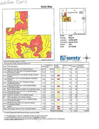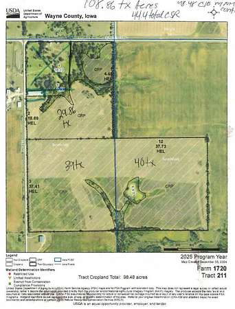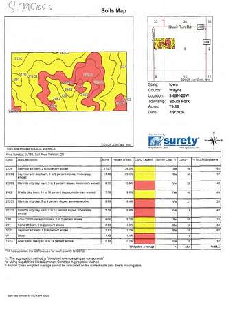 This is a nice 108.86 taxable acre farm that just came out of CRP and has an open lease for 2026 crop year. The CRP was well taken care of so no little cedar trees all over the place, which will make it much easier to prep the farm for crops. NRCS estimates there will be 98.48 tillable acres that will be continuous corn/bean no-till with Anhydrous. A total CSR of 44.4 on the whole farm, the South 79 acres comes in at a 47.1 CSR. An old homestead was surveyed off on the NW corner of the farm that measures 9.14 taxable acres. There are some draws with some trees and a nice pond measuring about 1.13 acres. Mostly it is an open farm from level to gently rolling to rolling. There have been some paths mowed for easy viewing. The farm is located North of Promise City, South Fork Township sections 3&4. There is not a lot on the market right now as this farm will make a nice tract for someone.