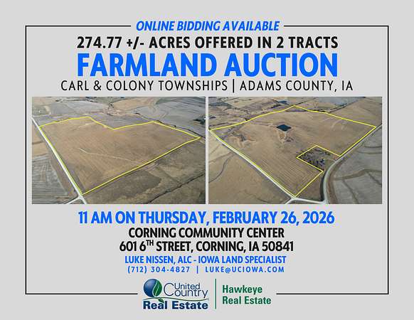 Located in Adams County, Iowa, these highly productive tillable farms consist of 274.77 +- total acres and will be offered in two separate tracts, providing buyers with flexible purchasing opportunities. For those unable to attend in person, live online bidding will be available through our virtual online auction platform. Situated just north of Prescott, Iowa, in Carl and Colony Townships, these farms offer a strong combination of productive tillable acres, established CRP income, and excellent long-term investment potential. Both tracts have been well maintained by a quality tenant and feature desirable CSR2 ratings in the mid to upper 60s. Full possession will be granted immediately upon the closing date. We invite you to join us at 11:00 AM at the Corning