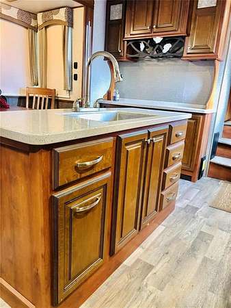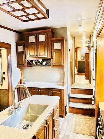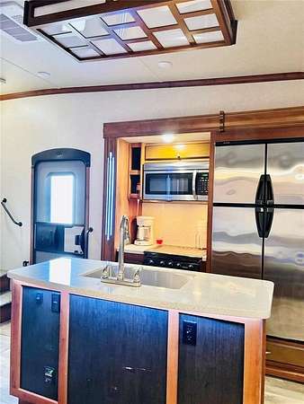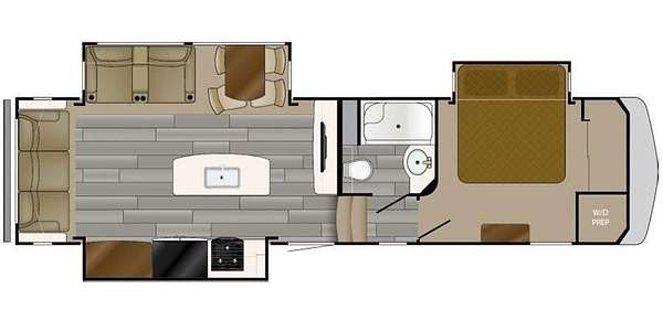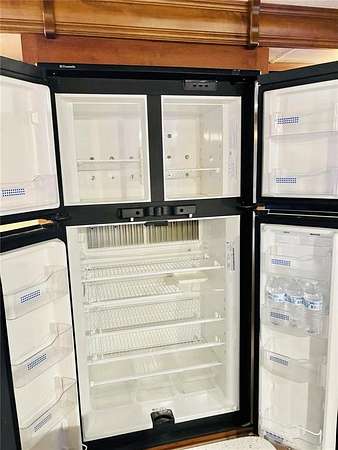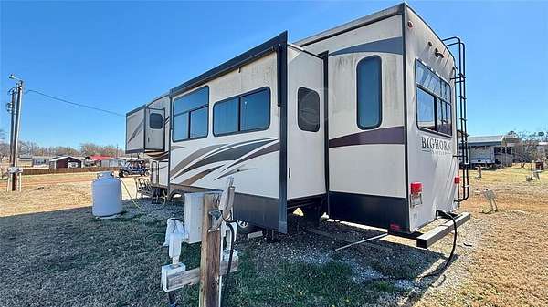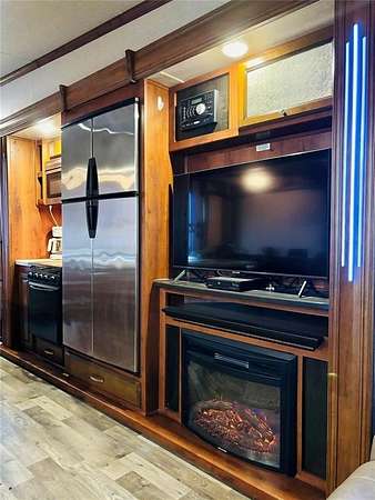 Inside the Bighorn, you'll find dual air conditioning systems, central vacuum, a kitchen island, French-door refrigerator, electric fireplace, built-in radio system, ceiling fan, two reclining massage chairs, and a fold-out couch--perfect for relaxing or entertaining. The private bedroom features a king-size bed, washer dryer hookups, and generous closet space. The open layout offers a comfortable flow for dining, lounging, and hosting guests.