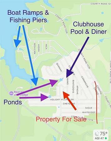 Driving North on Hwy 154 from Downtown Quitman turn right into Holiday Villages. Go through the security gate. Take left onto Rising Star. Property will be down on the left. Sign in Yard.