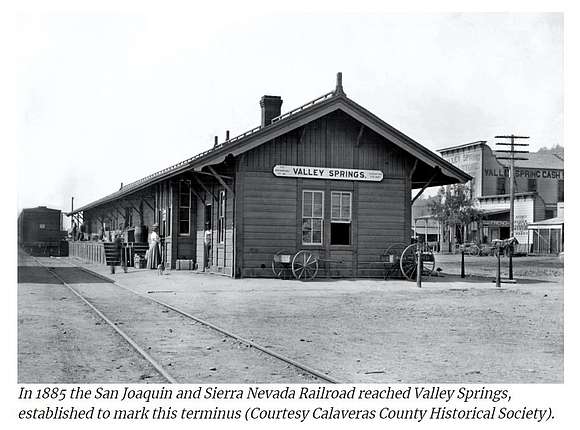 VALLEY SPRINGS: Since the Gold Rush, the West Calaveras area has been Calaveras County's Gateway to the Mother Lode. From stage stops along the route from Stockton to the San Joaquin & Sierra Nevada Railroad from Lodi that established Wallace, Burson and finally Valley Springs in 1884, the western section of the county has provided access to business and visitors to the Mother Lode. The area has also boasted its own resources, whether gold in Jenny Lind and Paloma, copper in Campo Seco or agriculture throughout the region. With Camanche, New Hogan, and Pardee reservoirs, the Tri-Dam area has most recently become a magnet for boating, fishing and camping. Today, while still a rural community, a residential real estate boom has made West Calaveras and Valley Springs a place to go to instead of a place to go through. Originally named Spring Valley and settled shortly after the discovery of gold in Coloma in 1849, Valley Springs served as a waypoint for travelers and prospectors heading to San Andreas to the east, Jenny Lind, and Copperopolis to the south, and Ione, Jackson, and Sutter Creek to the north. Valley Springs was not a gold rush town, though it served as a resting point for many miners. Prior to Anglo settlements, the area also served as a waypoint for native Mi-Wuk and Yokut tribes traveling from lower to higher elevations. Evidence of pre-historic settlements have not been found in Valley Springs, however grinding stones found in Valley Springs indicate that Native Americans passed through it. Source: Sierra Nevada Geotourism.