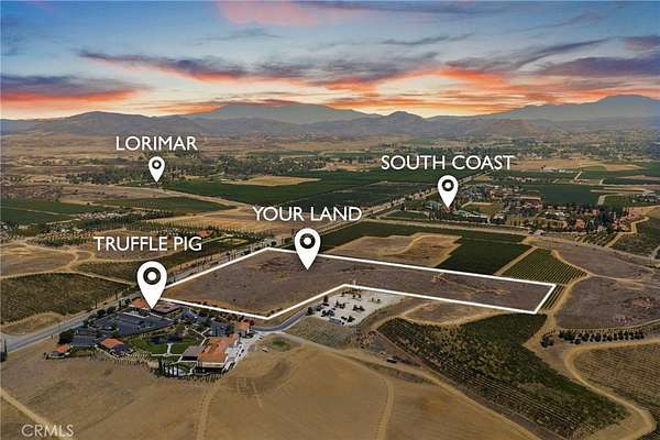 Incredible opportunity to develop a premiere Winery in the heart of the Temecula Wine Country with this approved plan for approximately 38,000 square feet, which includes a Winery, Restaurant, Tasting Room, Special Event Facility, Administrative Offices, and a private residencee of 5,282 SF! The existing approvals will save years of processing!! The property is located directly on Rancho California Road - Just west of Anza Road, offering excellent visibility and access. The parcel offers 360 degree views - and is very gentle, requiring minimal grading which will save on development costs! Close to South Coast Winery, Truffle Pig Winery, Lorimar Winery and Ultimate Winery - the location is second to none!