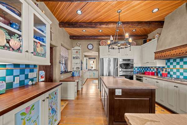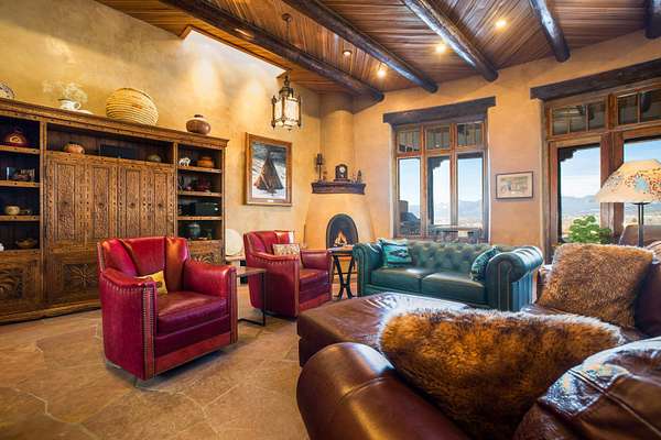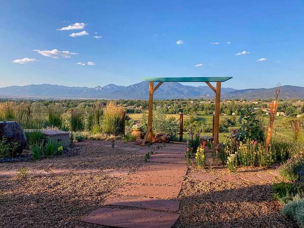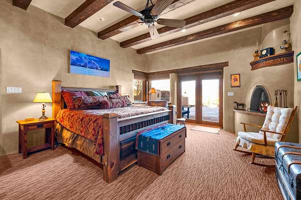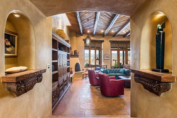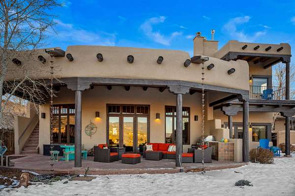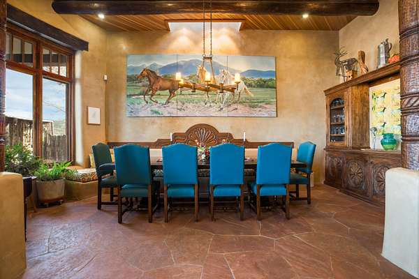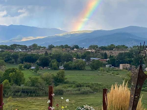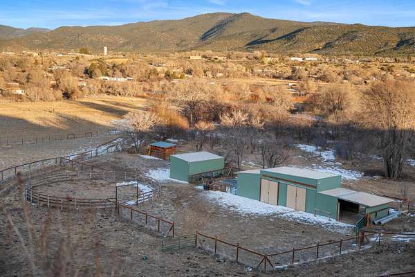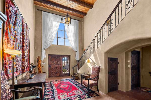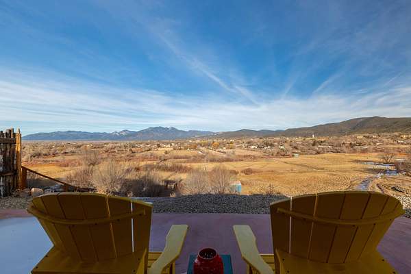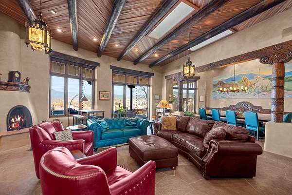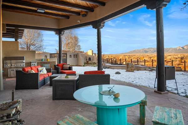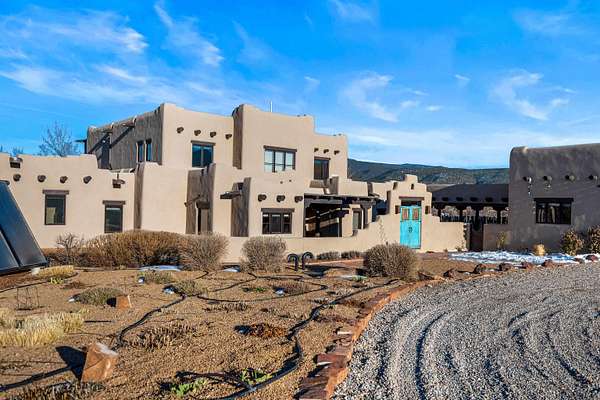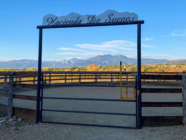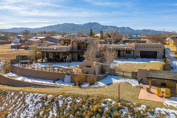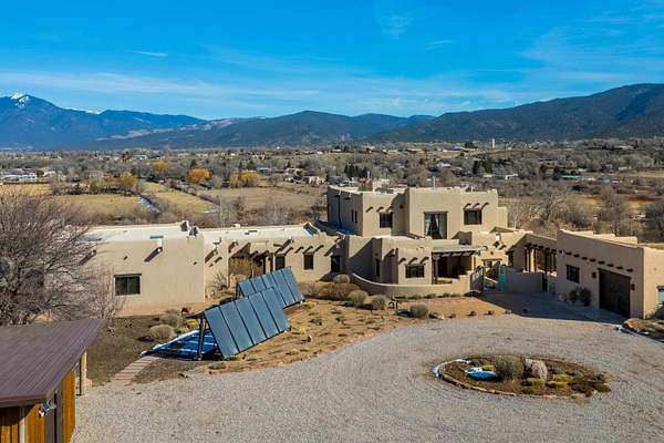 Hacienda de Suenos is a luxury Taos estate and custom adobe-style residence showcasing classic Southwestern architecture, 5 bedrooms, 3 full baths, and 2 half baths, offering approximately 5,995 square feet of living space on 2.05 fully fenced acres in Ranchos de Taos overlooking the Talpa Valley. The property captures expansive views of Taos Mountain, El Salto, and the lush Talpa Valley while maintaining privacy, security, and convenient access to town amenities. A hand-carved front door opens to a grand entry with soaring ceilings, vigas, abundant natural light, and interiors designed to honor traditional New Mexican craftsmanship. The home includes five well positioned bedrooms, including two primary suites with private outdoor seating areas and mountain views. A spacious private office provides a refined and quiet setting for work, study, or creative pursuits. Bathrooms feature hand-painted cabinetry and colorful tile reflecting artisan detail and regional character. The kitchen and pantry are designed for both daily living and entertaining, featuring premium appliances, generous workspace, and easy flow to adjacent living areas. An elegant dining room with banco seating and hand-carved wood details provides a distinctive setting for intimate dinners and larger gatherings. Three fireplaces, two wood-burning and one gas, provide warmth, architectural interest, and year-round comfort. Designed for the Taos lifestyle, the property emphasizes seamless indoor-outdoor living. Exterior features include an outdoor kitchen, multiple covered and open seating areas, and a hot tub positioned to enjoy open skies, valley views, and evening sunsets. Established perennial and vegetable gardens, mature fruit trees, and thoughtfully landscaped grounds enhance the sense of a private valley retreat. Infrastructure reflects long-term planning and energy efficiency. The home incorporates passive and active solar design, radiant floor heating for consistent comfort throughout the colder months, and an extensive solar hot water heating system that maximizes efficiency and energy savings. A natural gas-powered generator provides dependable electrical backup during outages. Two garages, along with a heated tack room and storage shed, provide practical comfort and year-round functionality. A comprehensive security system with integrated cameras and private gated entrances further supports privacy and peace of mind. The 2.05-acre parcel provides open space, panoramic views, and access to the road below for quiet walks. Water rights to the Acequia del Finado Francisco Martinez convey with the property, an increasingly valuable asset in Northern New Mexico. Additional acreage is available separately and includes approximately 4.35 acres of pasture, a round pen, and barns with water and electricity, along with water rights to two additional acequias. This offering supports equestrian use and provides expanded flexibility for buyers seeking a Taos equestrian property or extended estate configuration. Hacienda de Suenos combines authentic Southwestern architectural detail, custom craftsmanship, solar infrastructure, water rights, privacy, security, and optional equestrian expansion in a desirable Ranchos de Taos setting overlooking the lush Talpa Valley, minutes from Taos Plaza, the Taos Country Club Golf Course, and Taos Ski Valley.