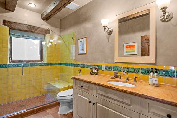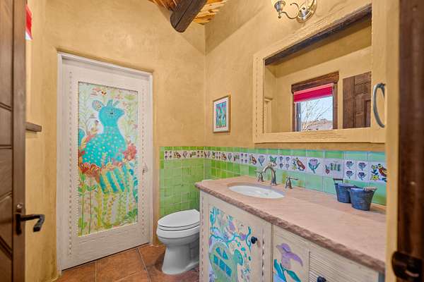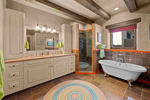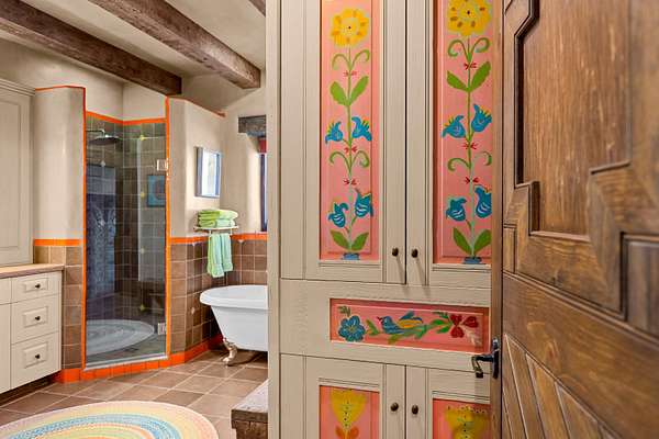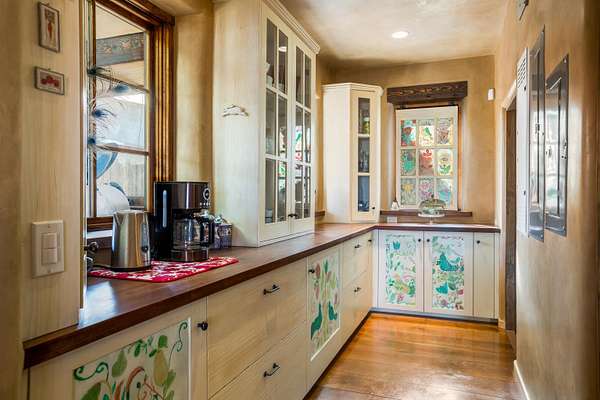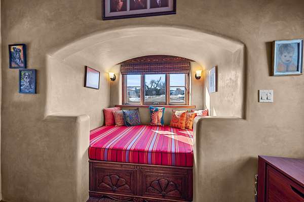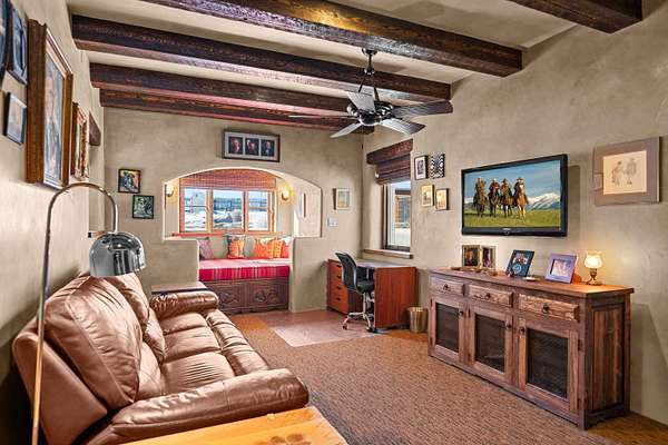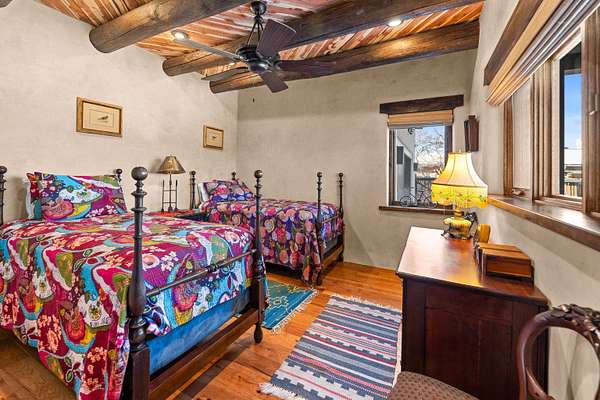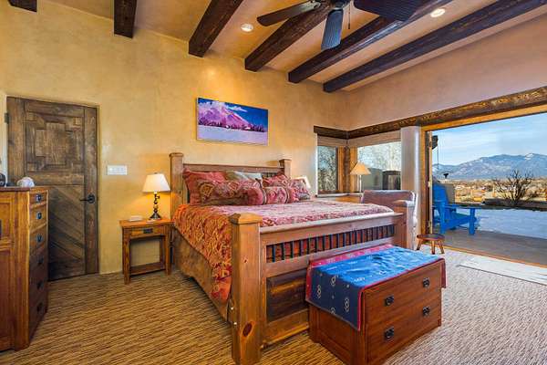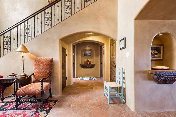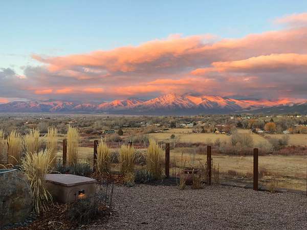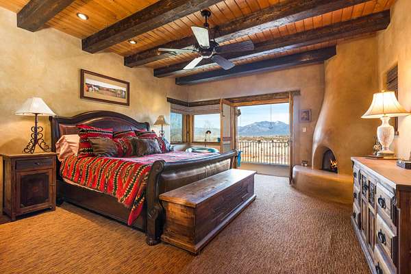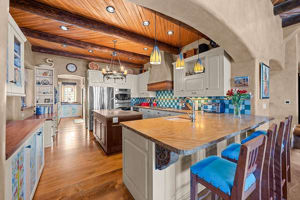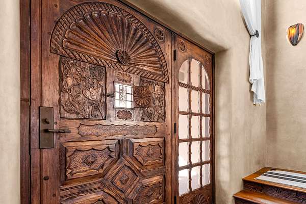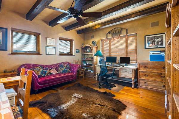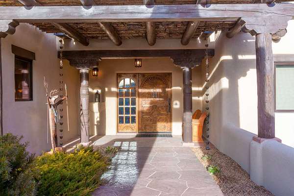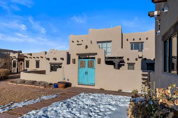 Hacienda de Suenos is a luxury Taos estate and custom adobe-style residence showcasing classic Southwestern architecture, 5 bedrooms, 3 full baths, and 2 half baths, offering approximately 5,995 square feet of living space on 2.05 fully fenced acres in Ranchos de Taos overlooking the Talpa Valley. The property captures expansive views of Taos Mountain, El Salto, and the lush Talpa Valley while maintaining privacy, security, and convenient access to town amenities. A hand-carved front door opens to a grand entry with soaring ceilings, vigas, abundant natural light, and interiors designed to honor traditional New Mexican craftsmanship. The home includes five well positioned bedrooms, including two primary suites with private outdoor seating areas and mountain views. A spacious private office provides a refined and quiet setting for work, study, or creative pursuits. Bathrooms feature hand-painted cabinetry and colorful tile reflecting artisan detail and regional character. The kitchen and pantry are designed for both daily living and entertaining, featuring premium appliances, generous workspace, and easy flow to adjacent living areas. An elegant dining room with banco seating and hand-carved wood details provides a distinctive setting for intimate dinners and larger gatherings. Three fireplaces, two wood-burning and one gas, provide warmth, architectural interest, and year-round comfort. Designed for the Taos lifestyle, the property emphasizes seamless indoor-outdoor living. Exterior features include an outdoor kitchen, multiple covered and open seating areas, and a hot tub positioned to enjoy open skies, valley views, and evening sunsets. Established perennial and vegetable gardens, mature fruit trees, and thoughtfully landscaped grounds enhance the sense of a private valley retreat. Infrastructure reflects long-term planning and energy efficiency. The home incorporates passive and active solar design, radiant floor heating for consistent comfort throughout the colder months, and an extensive solar hot water heating system that maximizes efficiency and energy savings. A natural gas-powered generator provides dependable electrical backup during outages. Two garages, along with a heated tack room and storage shed, provide practical comfort and year-round functionality. A comprehensive security system with integrated cameras and private gated entrances further supports privacy and peace of mind. The 2.05-acre parcel provides open space, panoramic views, and access to the road below for quiet walks. Water rights to the Acequia del Finado Francisco Martinez convey with the property, an increasingly valuable asset in Northern New Mexico. Additional acreage is available separately and includes approximately 4.35 acres of pasture, a round pen, and barns with water and electricity, along with water rights to two additional acequias. This offering supports equestrian use and provides expanded flexibility for buyers seeking a Taos equestrian property or extended estate configuration. Hacienda de Suenos combines authentic Southwestern architectural detail, custom craftsmanship, solar infrastructure, water rights, privacy, security, and optional equestrian expansion in a desirable Ranchos de Taos setting overlooking the lush Talpa Valley, minutes from Taos Plaza, the Taos Country Club Golf Course, and Taos Ski Valley.