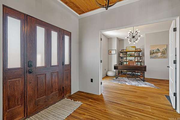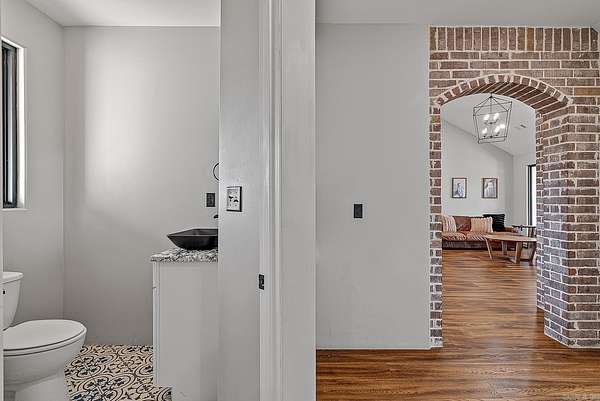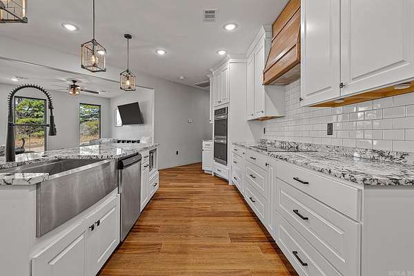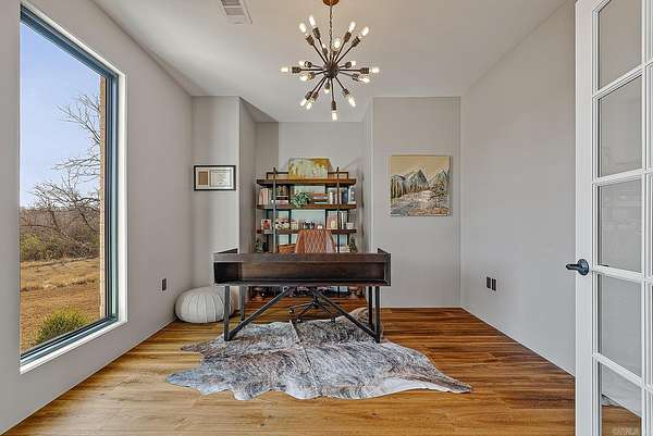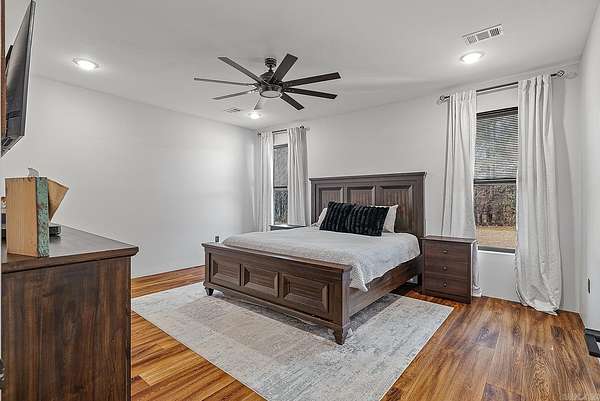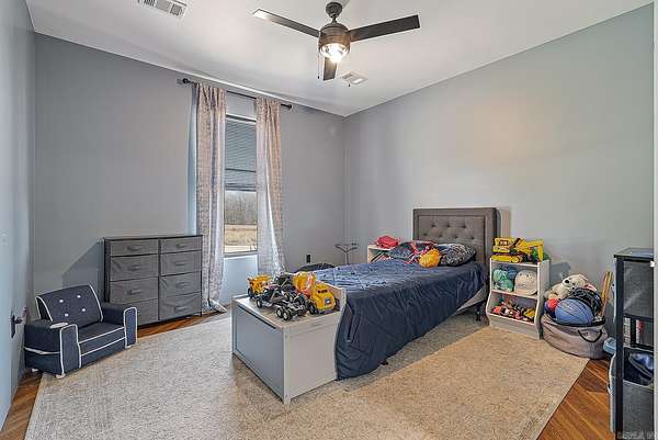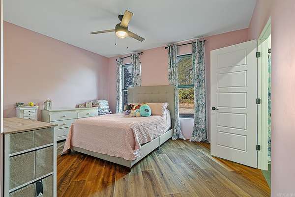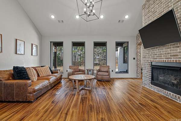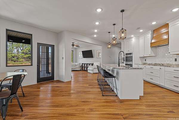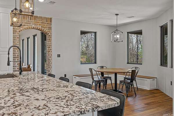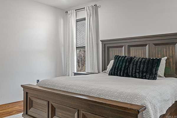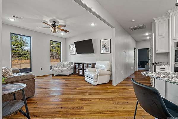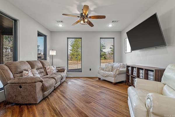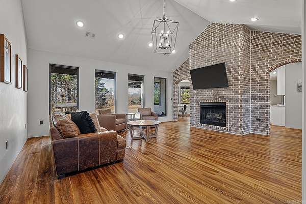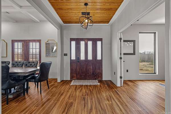 Stunning modern farmhouse situated on 40 acres of beautiful pastureland with scattered trees just outside Rector. Built in 2021, this white brick home offers 4 bedrooms, 3.5 baths, and thoughtfully designed living spaces throughout. The main level features wood flooring, a brick accent wall in the living room, wood-accent ceilings, and large windows that flood the home with natural light and peaceful views. The layout includes a dedicated office, formal dining room, family room, and an eat-in kitchen with breakfast bar. The kitchen boasts granite countertops, tile backsplash, custom vent hood, and a commercial-grade refrigerator. Decorative tile highlights the half bath, while the mudroom/laundry area features charming brick flooring. The primary suite offers a spa-like walk-through tiled shower and two walk-in closets. Upstairs includes a bonus room with a full bath and fourth bedroom, offering the option of a fifth bedroom. Additional features include a safe room, spacious bedrooms, patio, and porches perfect for enjoying the quiet country setting.