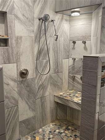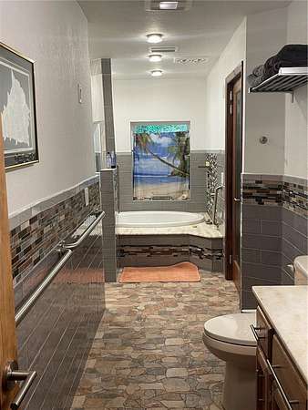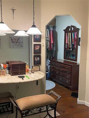 - Ceiling Fans(s), Eat-In Kitchen, High Ceilings, Primary Bedroom Main Floor, Solid Wood Cabinets, Stone Counters, Thermostat, Vaulted Ceiling(s), Walk-In Closet(s)