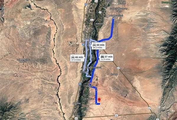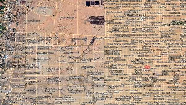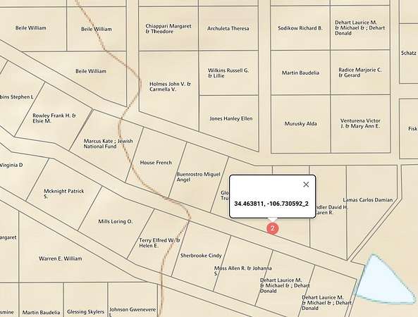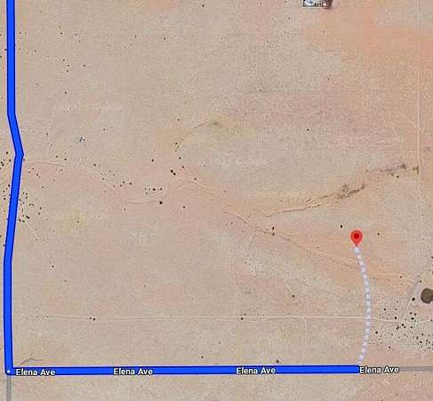 Drive south on NM 304 to San Lorenzo Rd. Turn east on San Lorenzo road (there will be some turns on this road).. Keep driving until you reach Pso Del Escarpado. Turn south and drive to Elena Ave. Once you reach or get close Elena Ave, do not drive further south. Stay a small distance north of the gully and drive east to reach the geo coordinates 34.463811,-106.730552. The coordinates are located at the SE SW boundary line between the two lots.