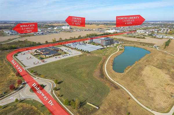 This 4.91-acre lot of C2 has all utilities to the lot and is in an amazing location just east of the Sedgwick building and at the roundabout intersection of Ridgeway and University Ct. in Coralville just north of the U of I Business Park. The price comes out to just $10 per foot, so it's below recent land sales prices. Please look at the amazing aerial photos and you'll see the new University hospital directly across Hwy #965 to the west, Hy-Vee and Forever Green Road just to the north, the U of I Research Park directly to the south and banks, food venues, coffee shops, retail stores and new personal service locations all around this area. Looking west across the hospital and along Forever Green Road, you'll find Tiffin in the distance with I-380 and Steindler Clinic clearly visible. There is also an abundance of attached and single-family housing with Middle and Elementary schools nearby, too. Lots 10 and 12 just recently sold to growing area businesses.