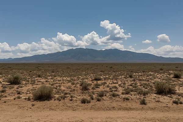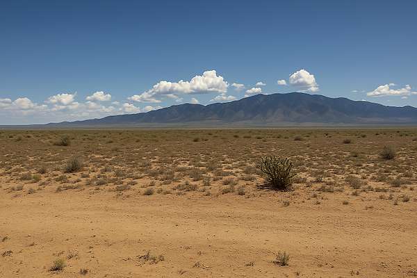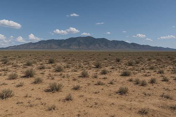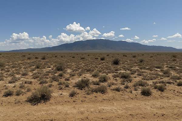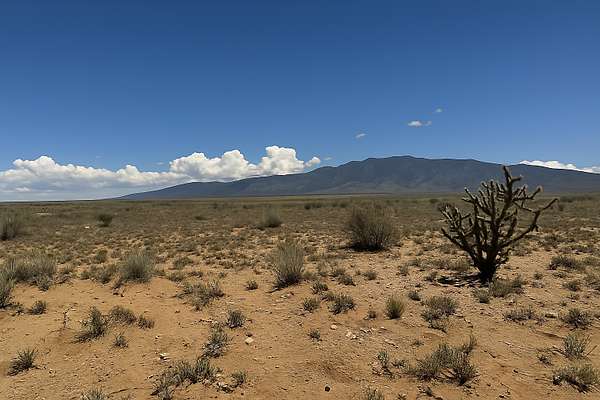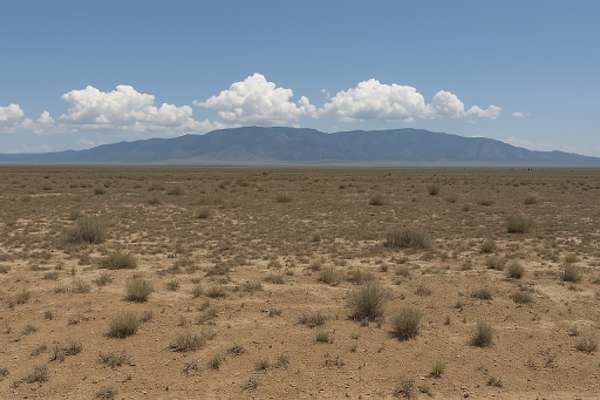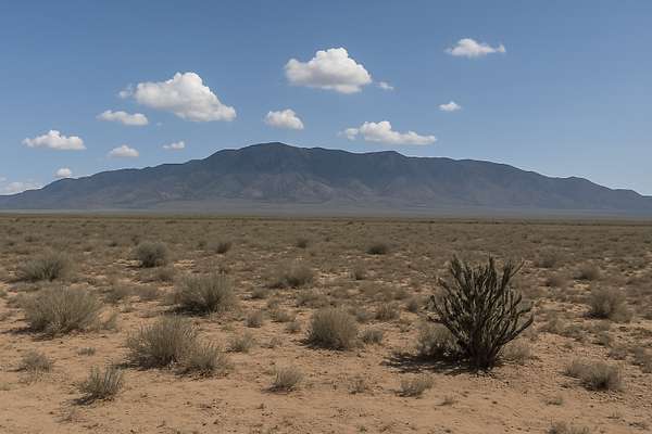 Open high desert, gentle slope, desert scrub, big skies, and Manzano views.