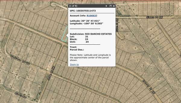 From the intersection of Unser Blvd NE and Northern Blvd NE, travel west on Northern Blvd NE. Turn right onto Encino Rd NW and then right onto Harmony Dr NW. The lots will be located on the left-hand side, just before hitting Niagara Rd.